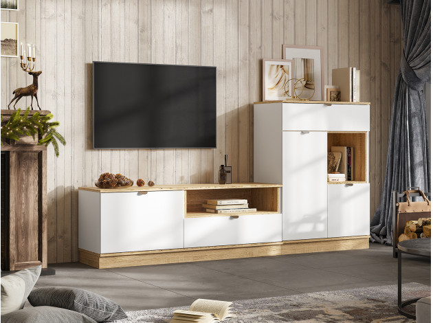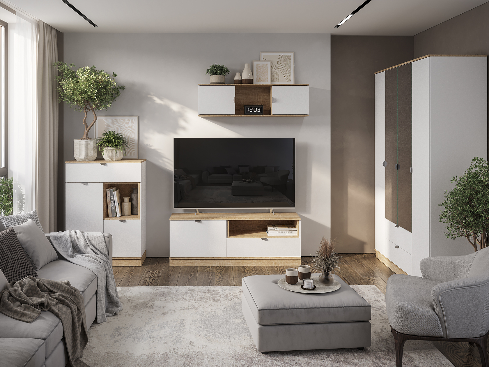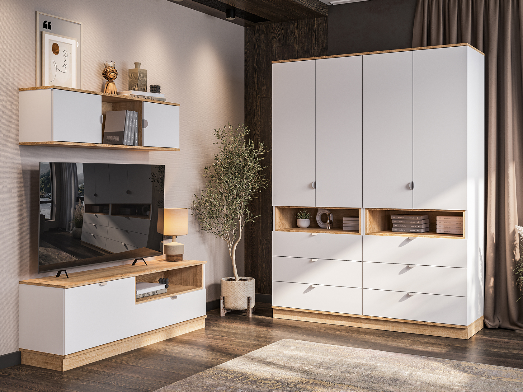 ТВ-тумба Юкка дополнит пространство гостиной и поможет разместить любую мультимедийную технику. Сочетание удобства с привлекательным внешним видом делает этот модуль идеальным выбором для любого помещения, где необходимо обустроить уютную и функциональную зону отдыха.