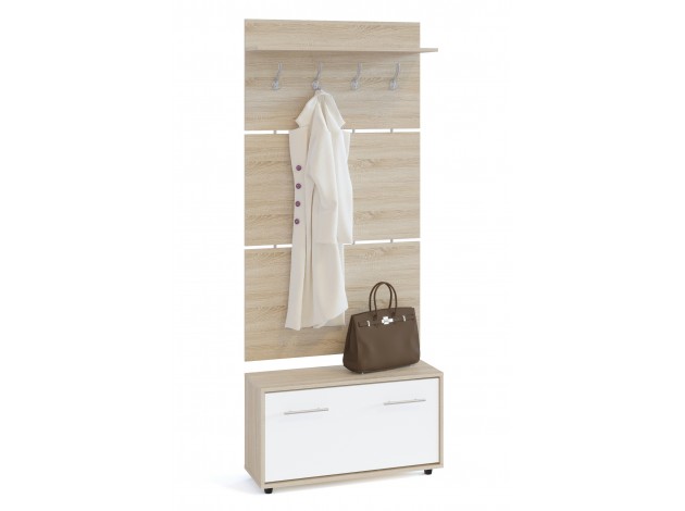 Широкая навесная вешалка Моренго позволит разместить сезонную одежду всей семьи. Модель состоит из трех панелей, соединенных металлическими вставками. На верхней панели располагается четыре трехрожковых крючка для одежды. Полка, закрепленная над крючками, предназначена специально для головных уборов и зонтов.