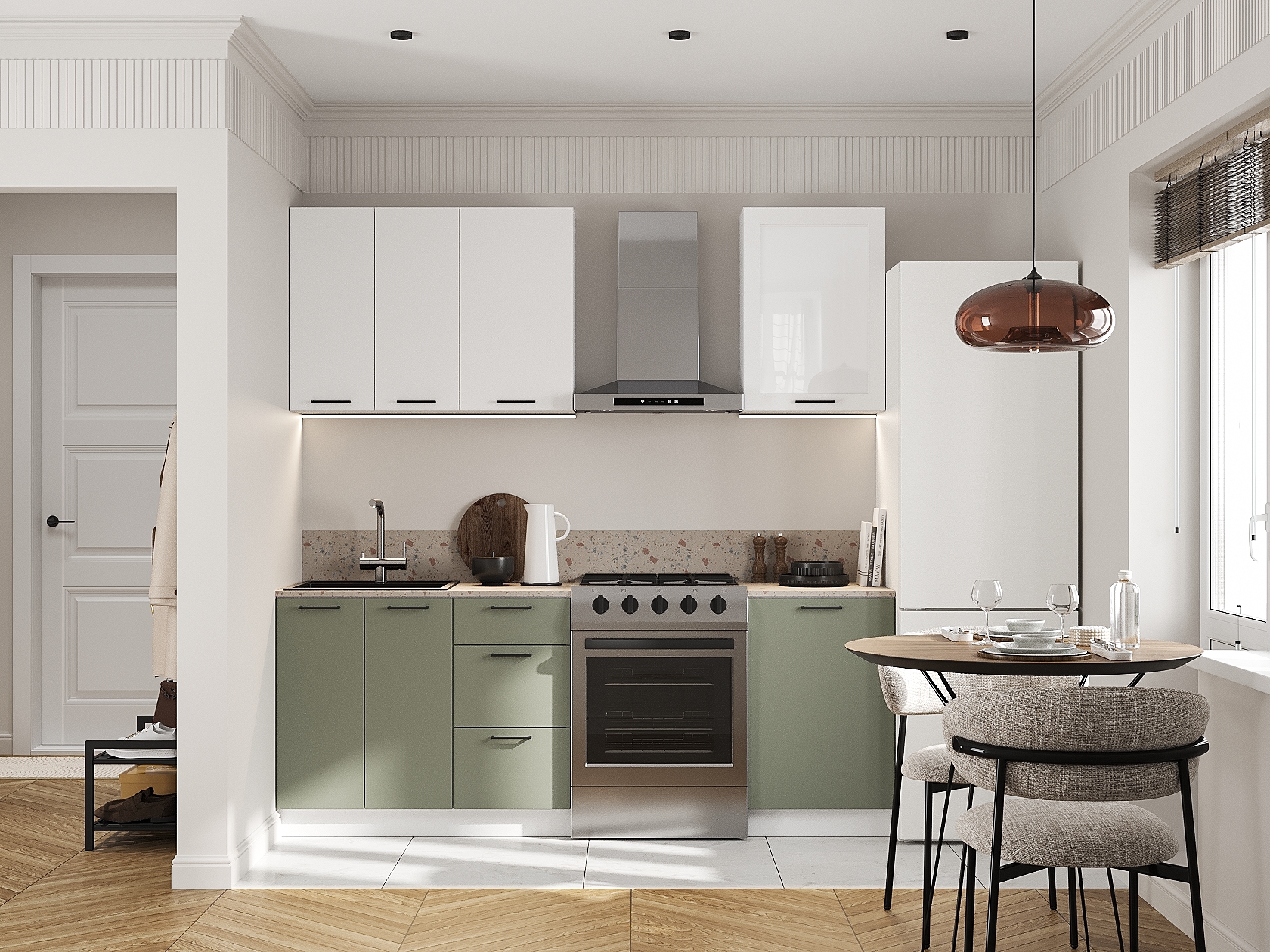 Кухонный гарнитур Аурелио 150 см Белый / Снежно-белый / Белый лакобель / Эвкалипт софт Скрытые «Дорадо»