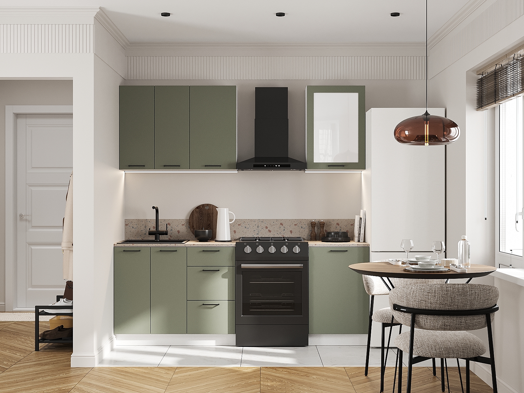 Кухонный гарнитур Аурелио 150 см Белый / Эвкалипт софт / Белый лакобель Скрытые «Дорадо»