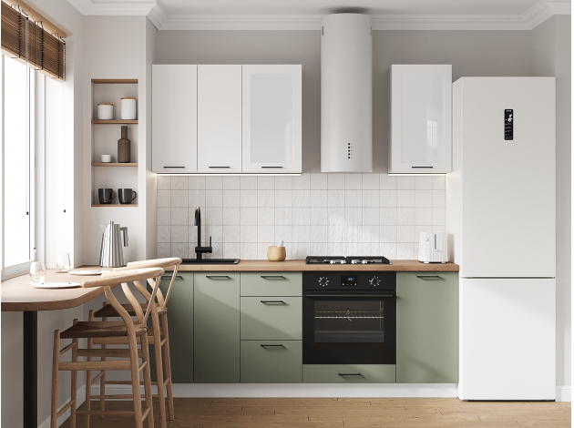 Кухонный гарнитур Аурелио 200 см Белый / Снежно-белый / Белый лакобель / Эвкалипт софт Скрытые «Старт»