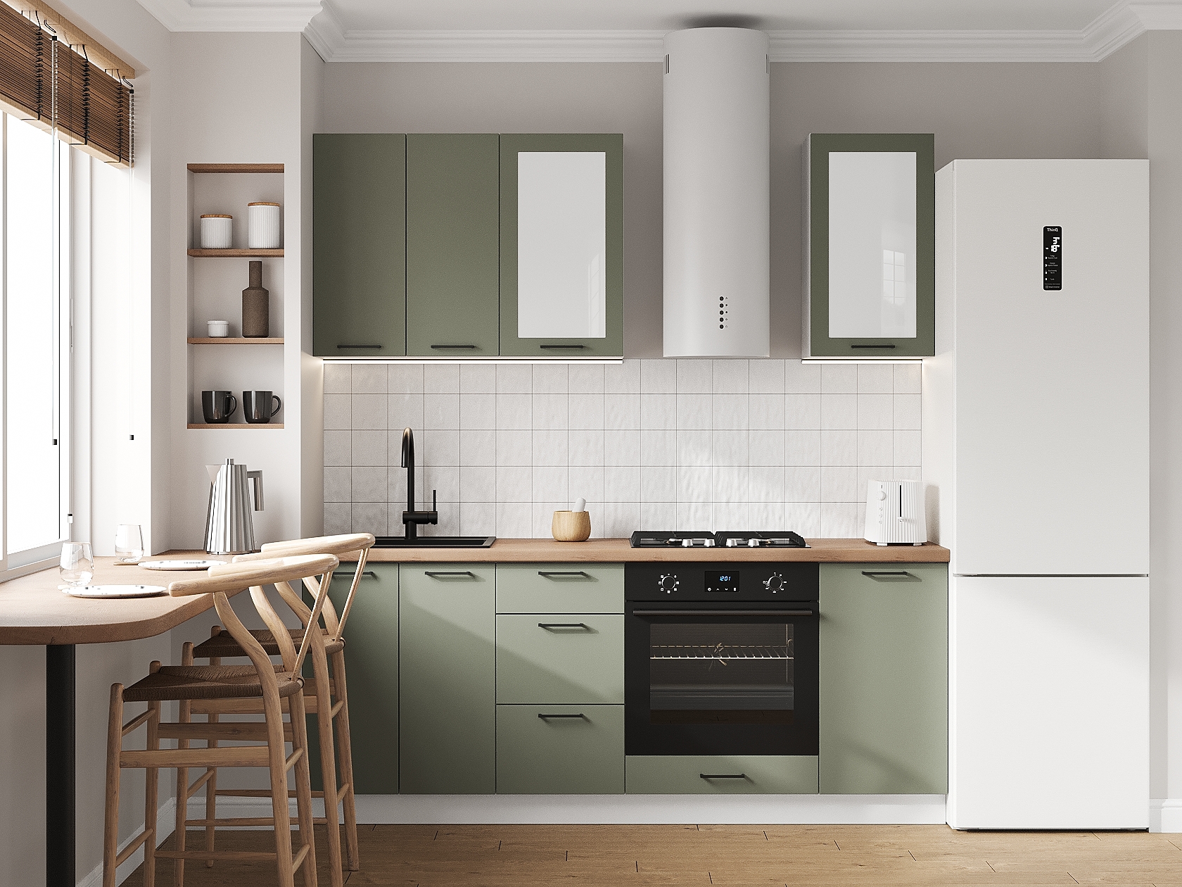 Кухонный гарнитур Аурелио 200 см Белый / Эвкалипт софт / Белый лакобель Скрытые «Дорадо»