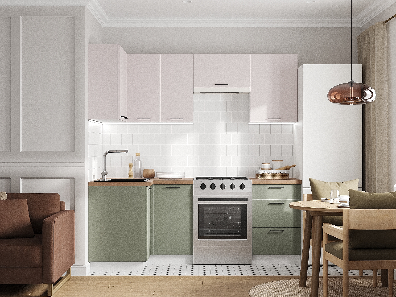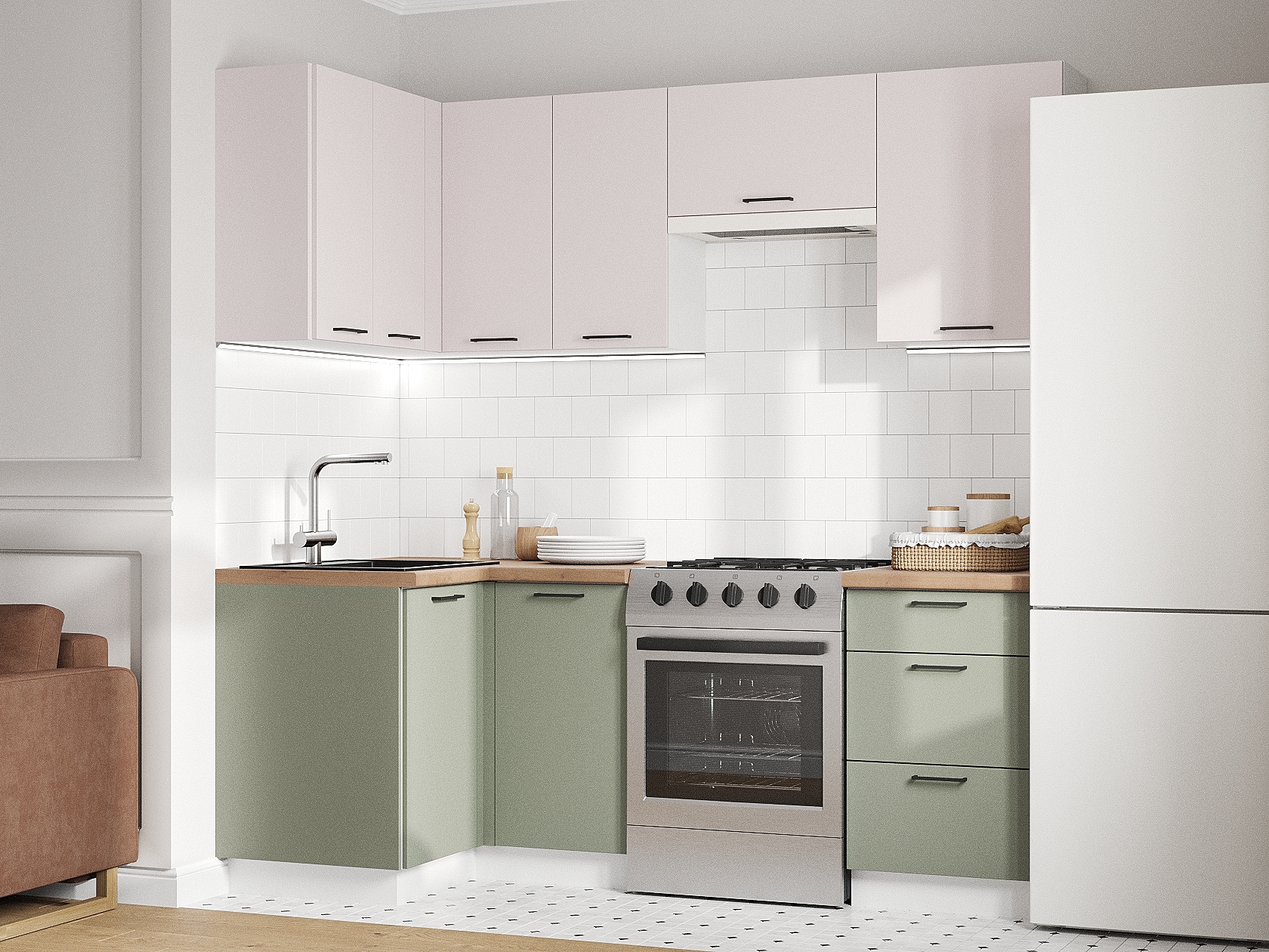 Кухонный гарнитур Аурелио 210х100 см Белый / Айриш / Эвкалипт софт Скрытые «Старт»