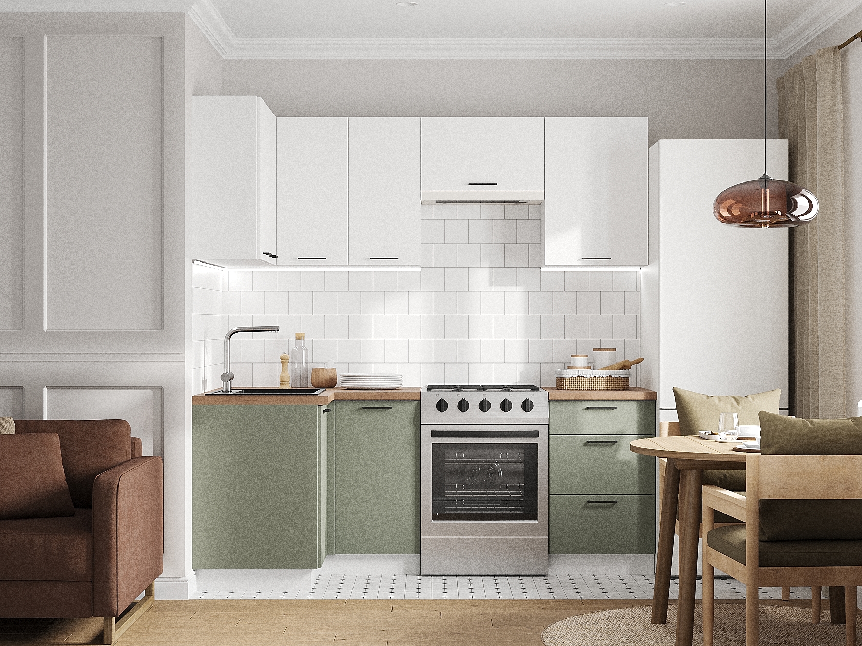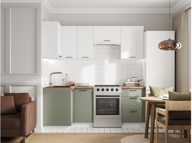 Кухонный гарнитур Аурелио 210х100 см Белый / Снежно-белый / Эвкалипт софт Шариковые