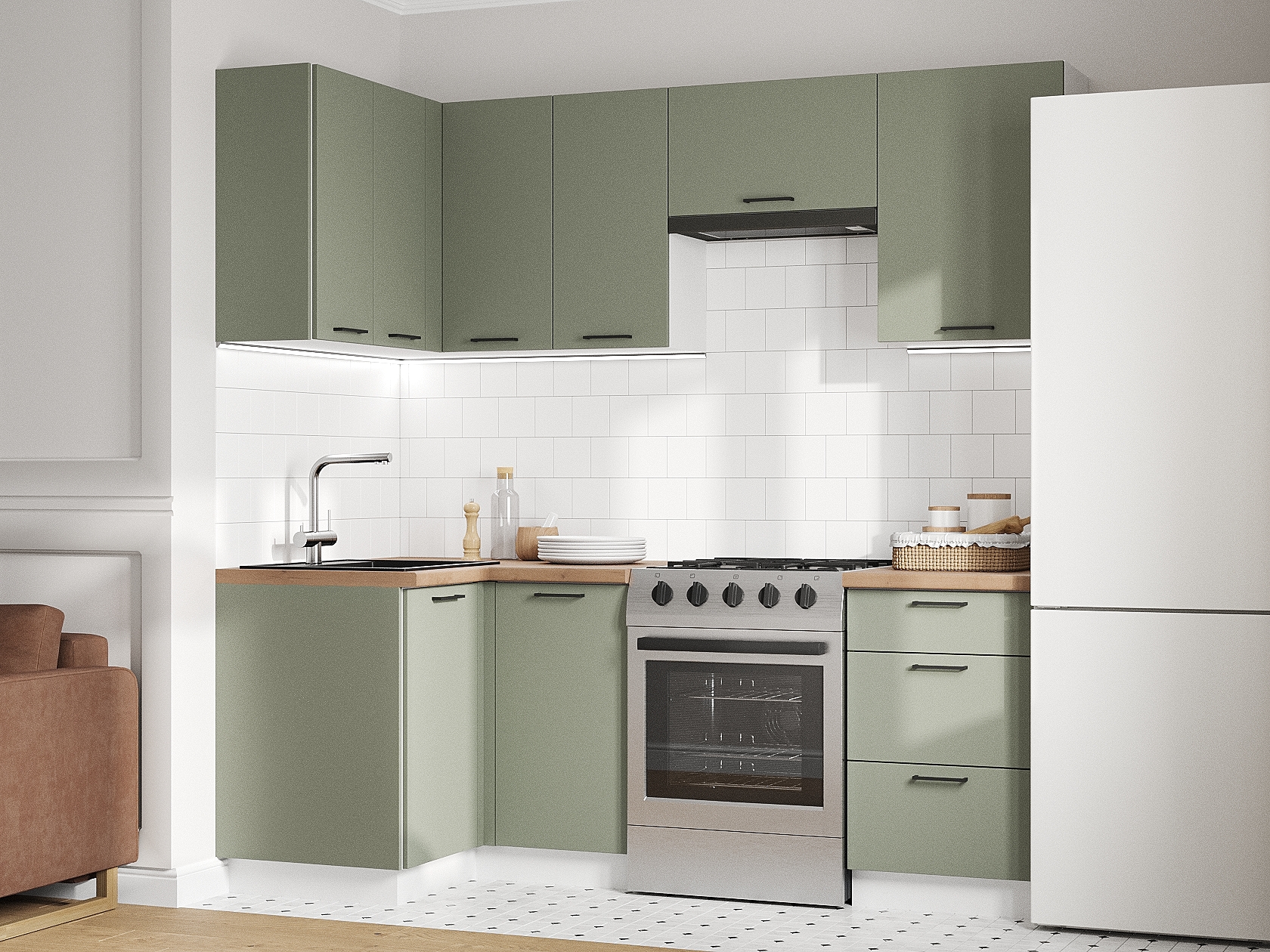 Кухонный гарнитур Аурелио 210х100 см Белый / Эвкалипт софт Шариковые