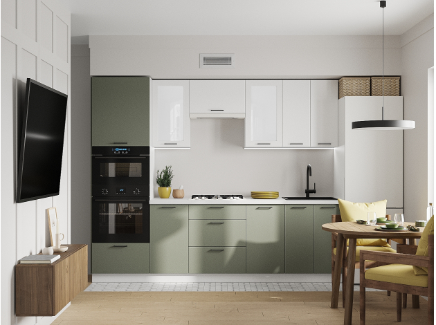 Кухонный гарнитур Аурелио 260 см Белый / Снежно-белый / Белый лакобель / Эвкалипт софт Скрытые «Старт»