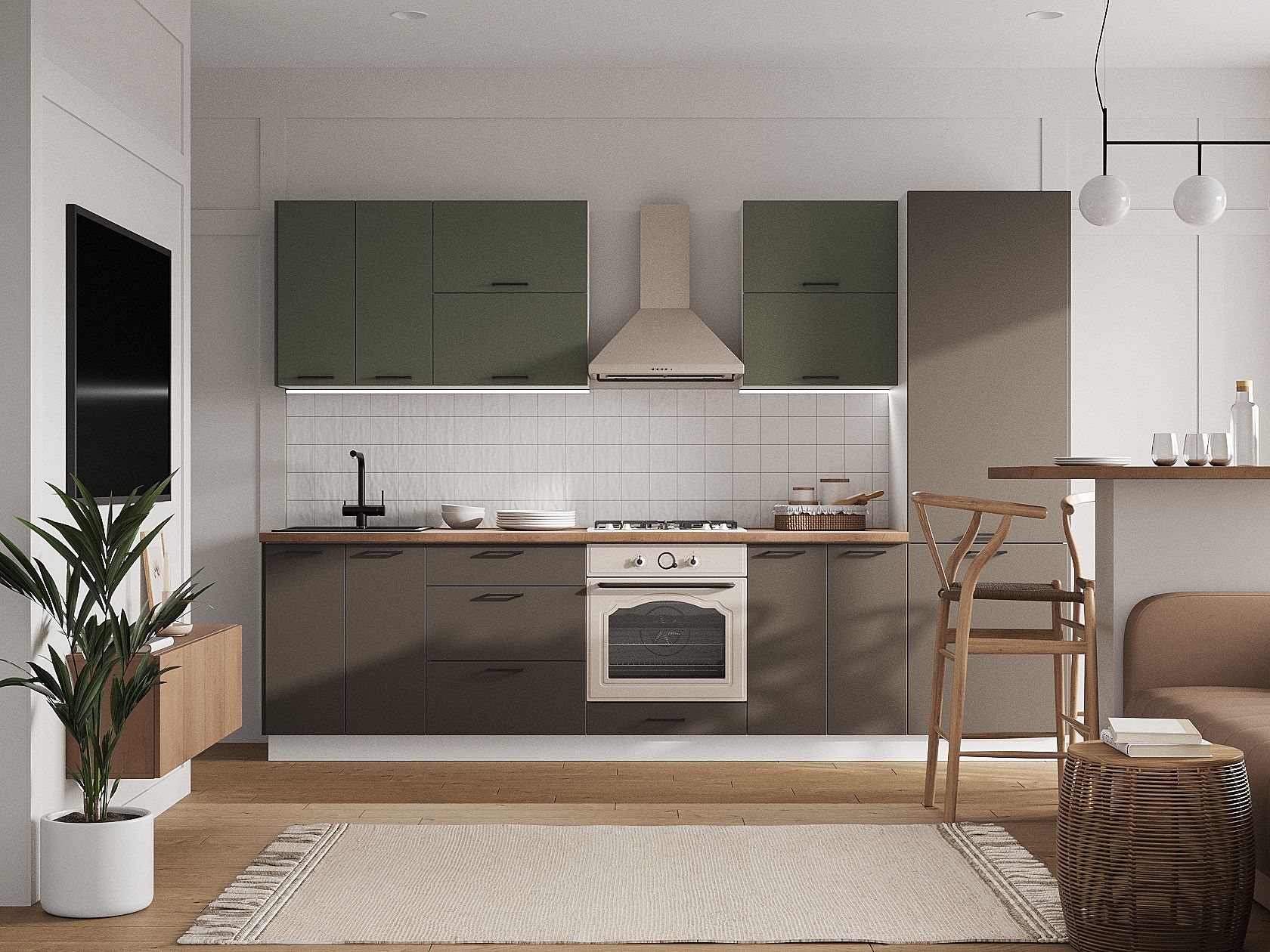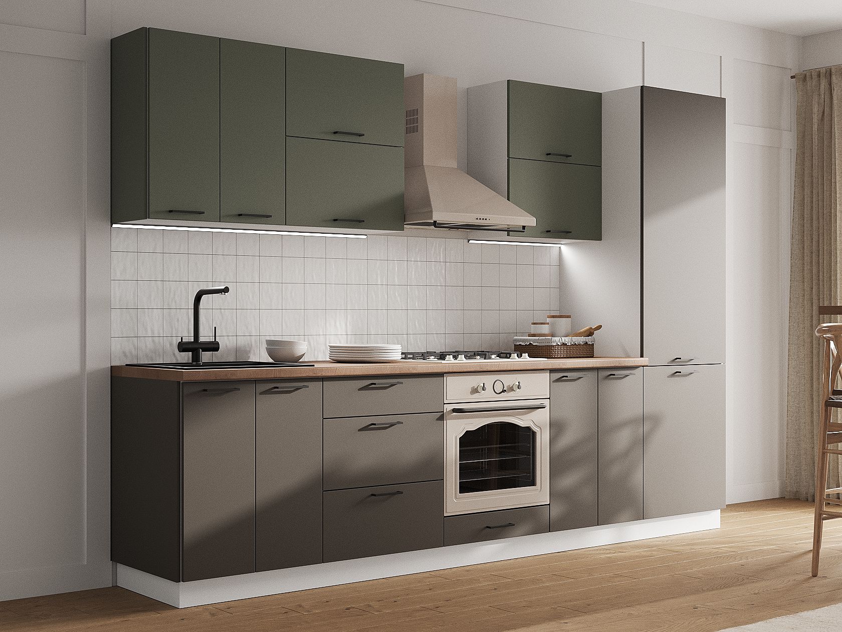 Кухонный гарнитур Аурелио 300 см Белый / Эвкалипт софт / Маренго Скрытые «Дорадо»