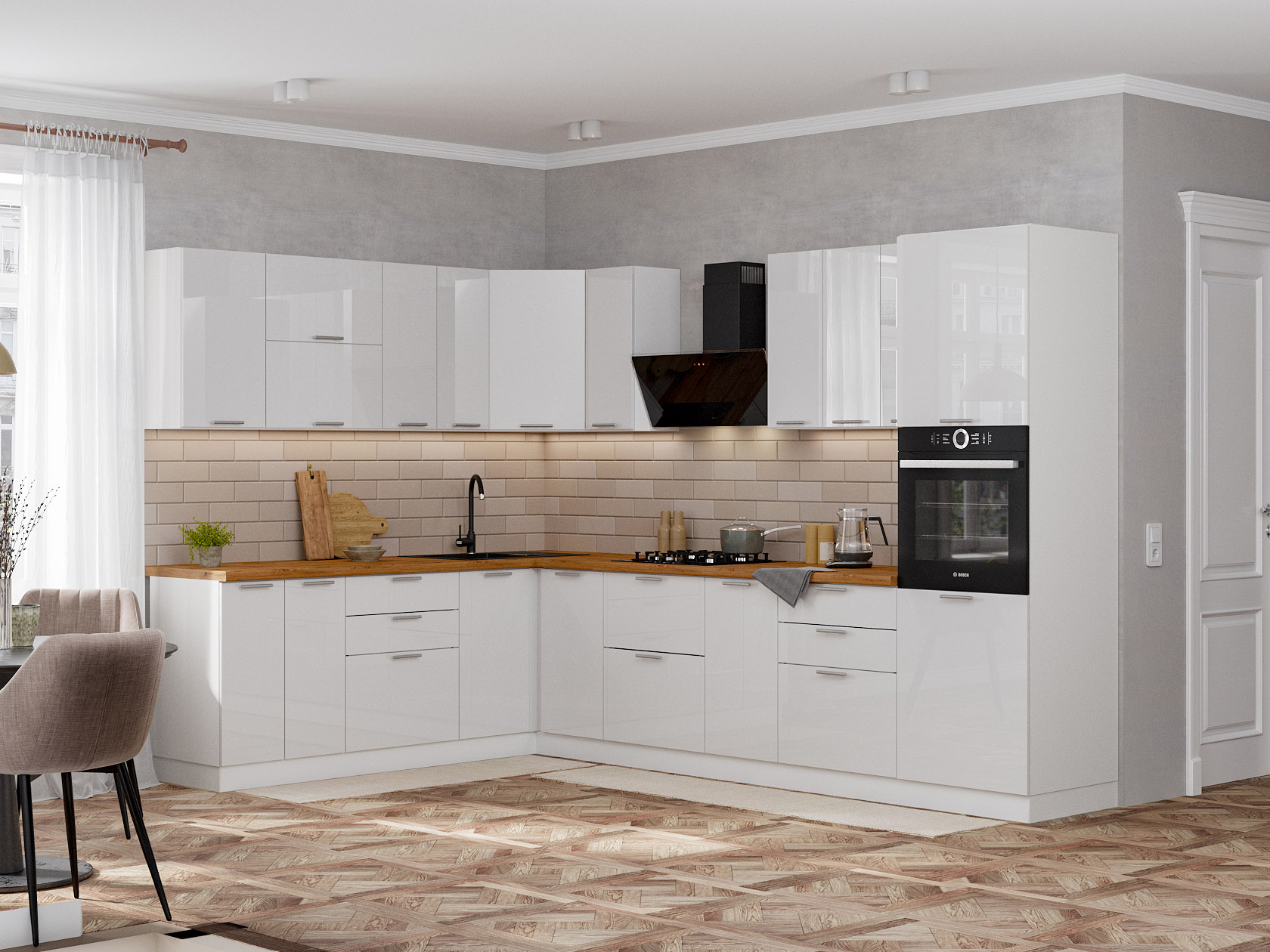 Кухонный гарнитур Бреста 320х220 см поможет эффективно использовать пространство, организовав место для хранения продуктов и приготовления пищи. Глянцевые фасады придают мебели ухоженный и сияющий вид. Строгие геометрические линии дополнены стильными продолговатыми ручками, что придает актуальный вид любому интерьеру.