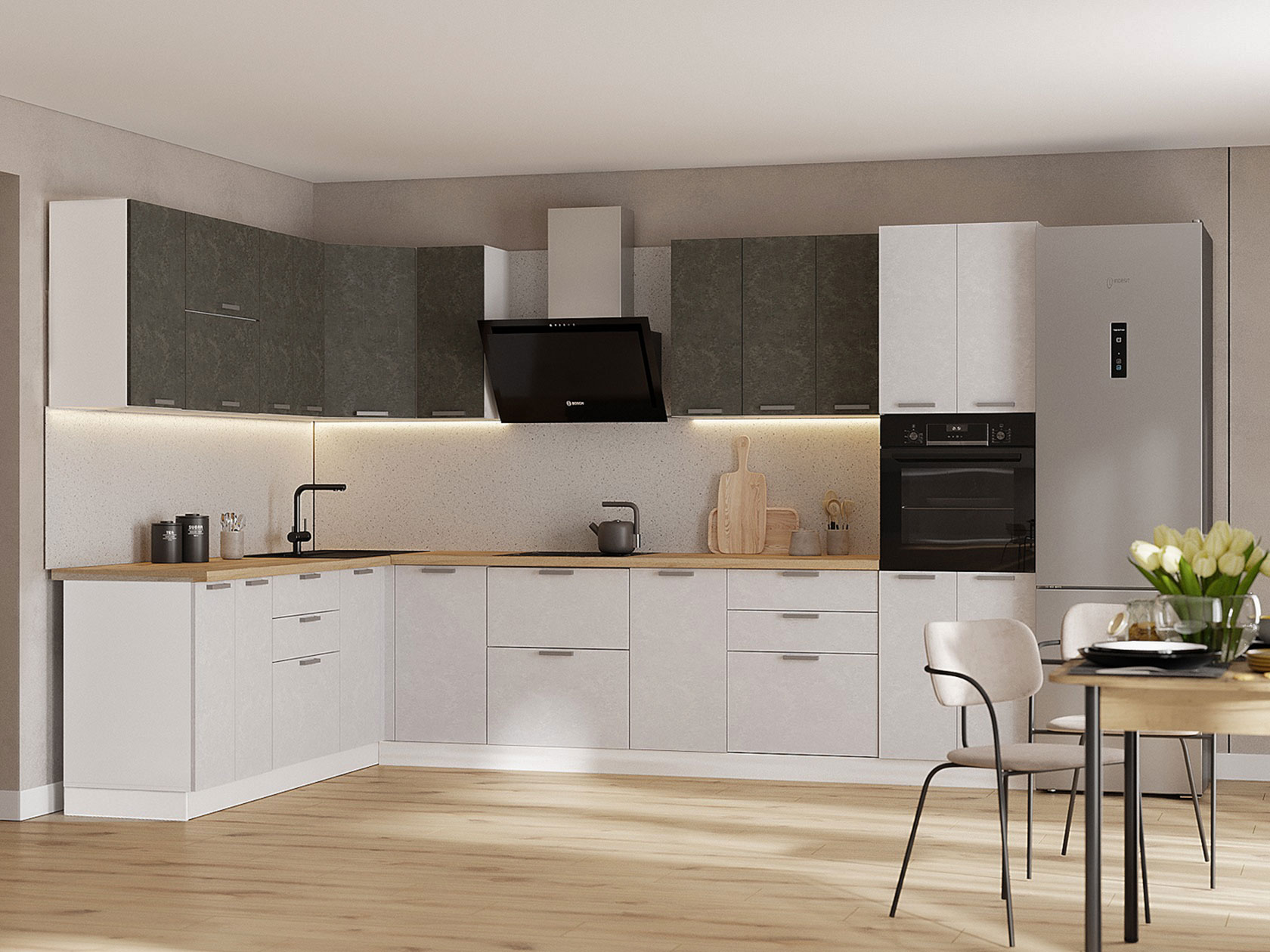 Кухонный гарнитур Бридж 320х220 см вместительный, современный и практичный. Конструкция и расположение элементов позволяют эффективно использовать пространство и организовать удобное хранение. Лаконичные матовые фасады легко очищаются от загрязнений, что делает уход за мебелью простым и необременительным.