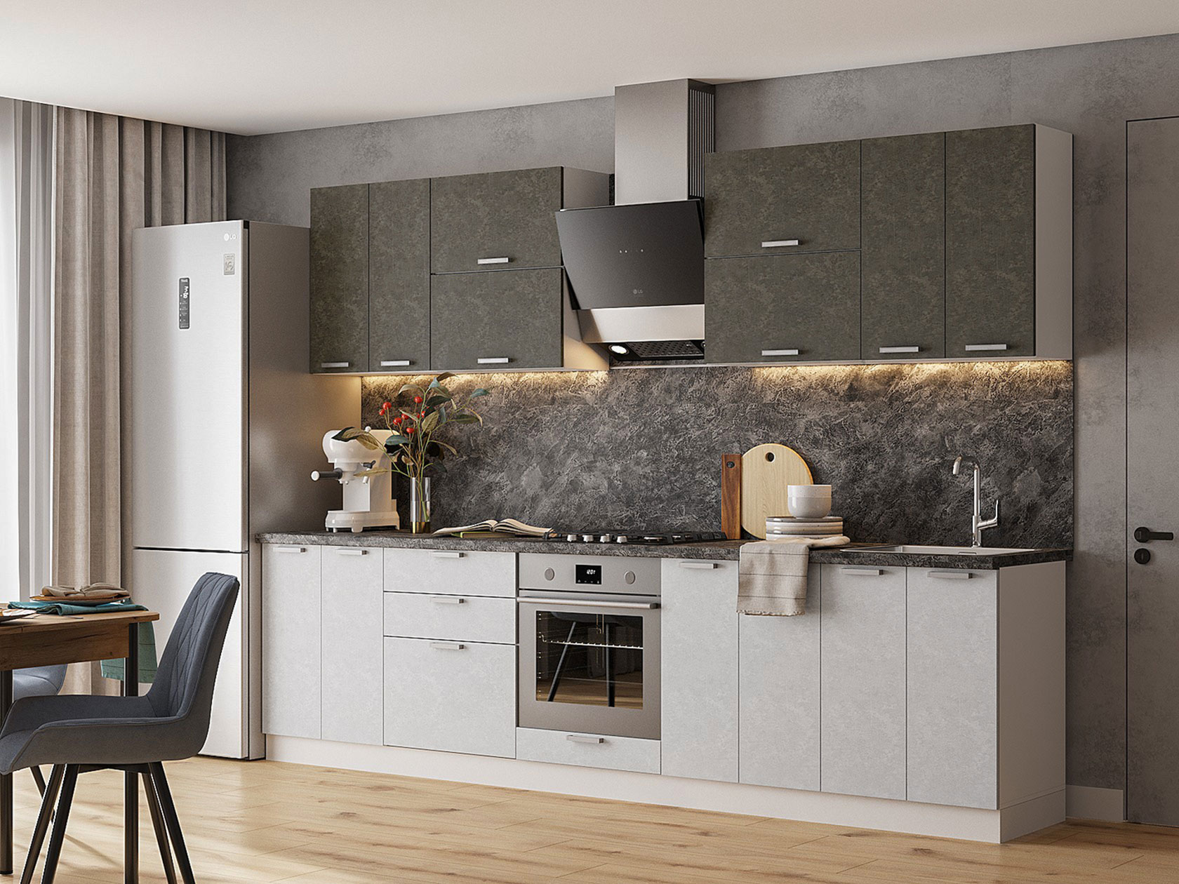 Кухонный гарнитур Бридж 300 см — это современный дизайн, практичные материалы и качественная фурнитура. Элементы идеально дополняют друг друга, образуя удобное пространство для хранения утвари и приготовления пищи. Матовые фасады без лишних деталей легко очищаются от загрязнений, что делает уход за мебелью простым и необременительным.
