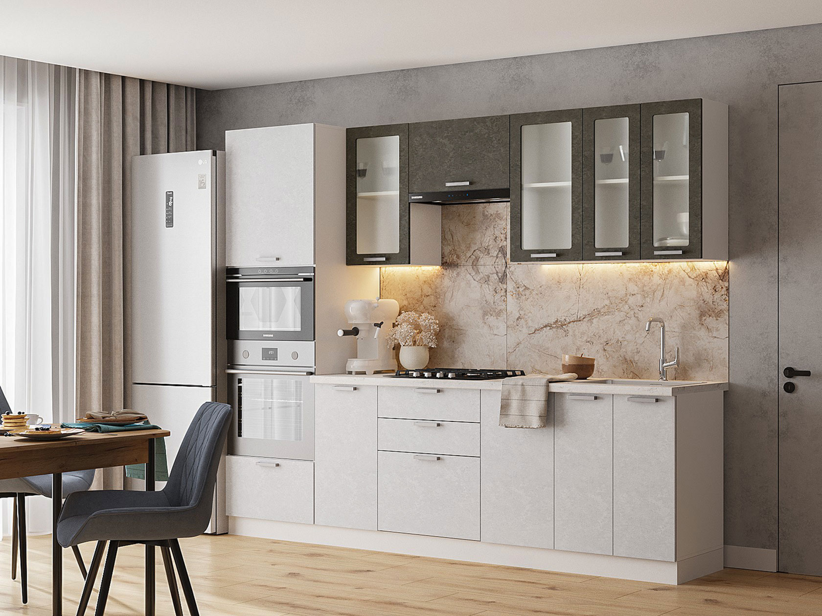 Кухонный гарнитур Бридж 260 см идеально подходит для небольшой квартиры. Набор элементов организует удобное пространство для кулинарных экспериментов и повседневных хлопот. Ухаживать за мебелью несложно: гладкие матовые фасады без особых усилий очищаются от загрязнений.