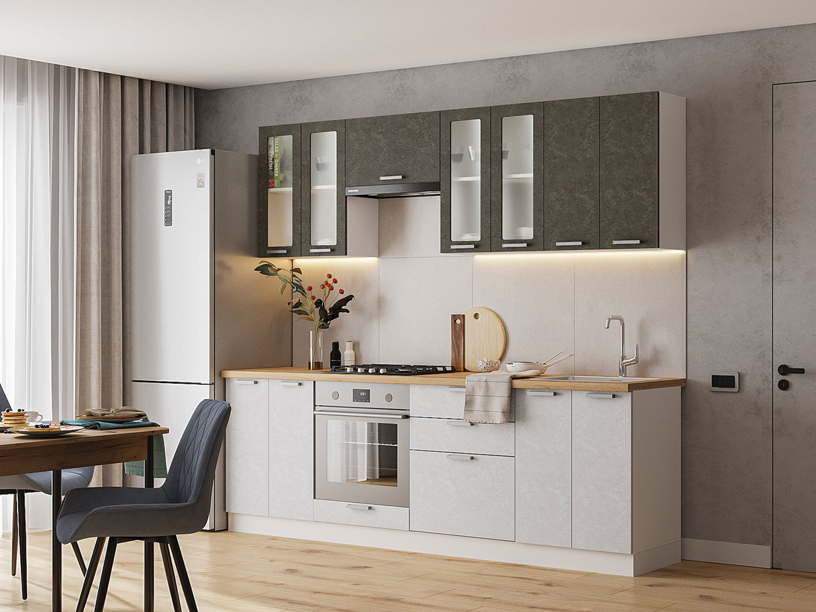Кухонный гарнитур Бридж 240 см состоит из нескольких элементов, которые идеально дополняют друг друга. Сочетание разных оттенков и текстур вносит разнообразие в современный интерьер. Ухаживать за мебелью несложно: матовые фасады без рамок и декора легко очищаются от загрязнений, и на них почти не видны отпечатки пальцев.