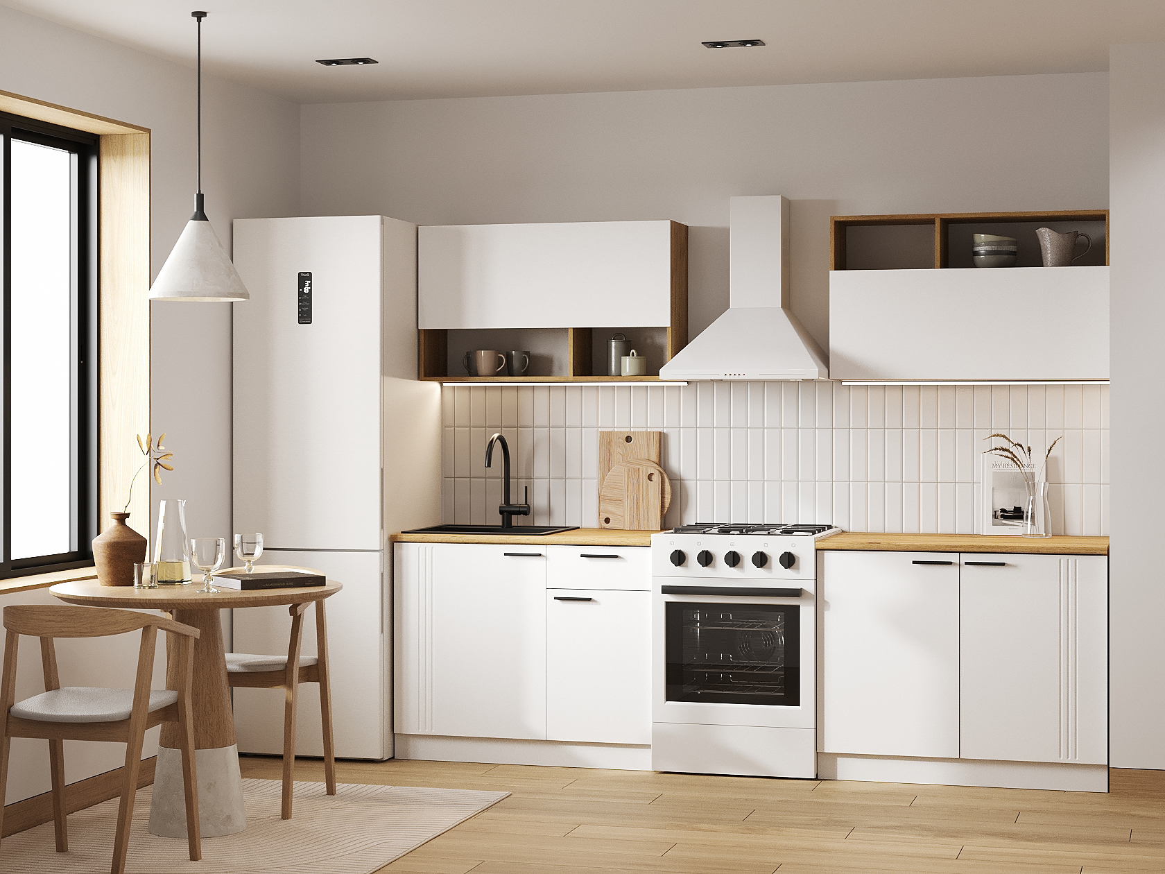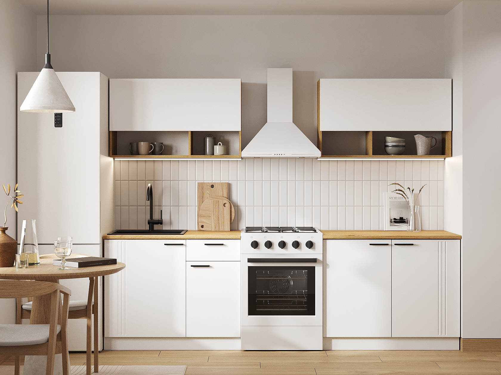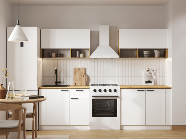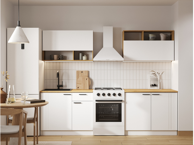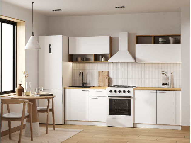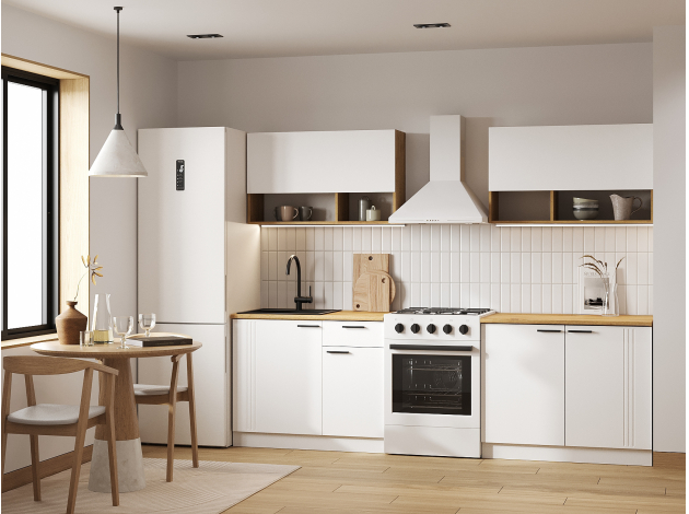 Кухонный гарнитур Брук 200 см — готовое решение для оформления интерьера с удобной системой хранения. Особенность дизайна — сочетание матовых фасадов и древесной текстуры. Прямая конфигурация позволяет адаптировать мебель под небольшое пространство.