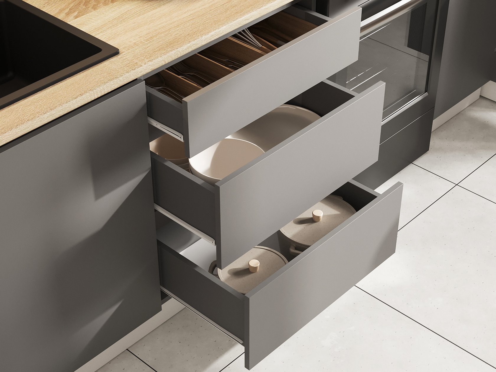 Модуль с ящиками не имеет универсальной сборки. Ящики всегда располагаются слева от мойки.