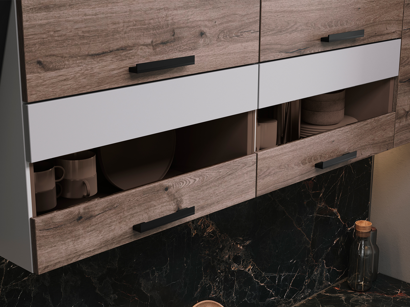 Кухонный гарнитур Эра 160 см — современное функциональное решение для небольшой квартиры или дачи. Компактные элементы помогут удобно хранить посуду, продукты и хозяйственные принадлежности. Матовые фасады с природной текстурой создают привлекательный облик мебели. Опоры регулируются по высоте, что позволяет установить столы на полу с небольшими неровностями.