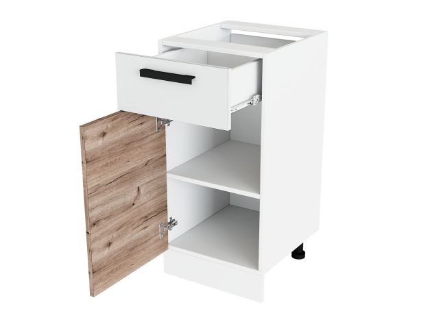 - Фурнитура распашной дверцы: накладные петли без доводчиков.