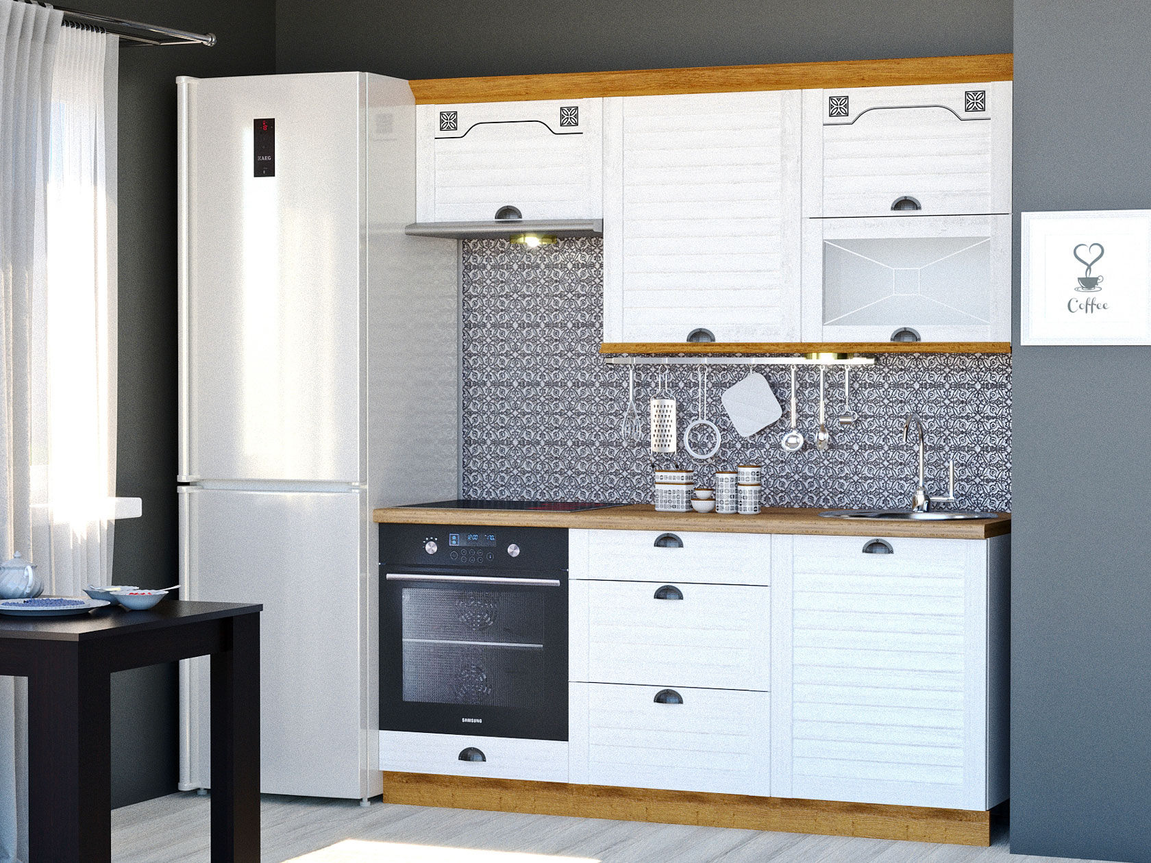 Кухонный гарнитур Кантри 180 см — компактное решение для небольшого пространства. Натуральные оттенки и древесные текстуры создают ощущение домашнего уюта и гармонии с природой. Оригинальные ручки, карнизы и жалюзийные фасады — акценты, которые оживляют обстановку.