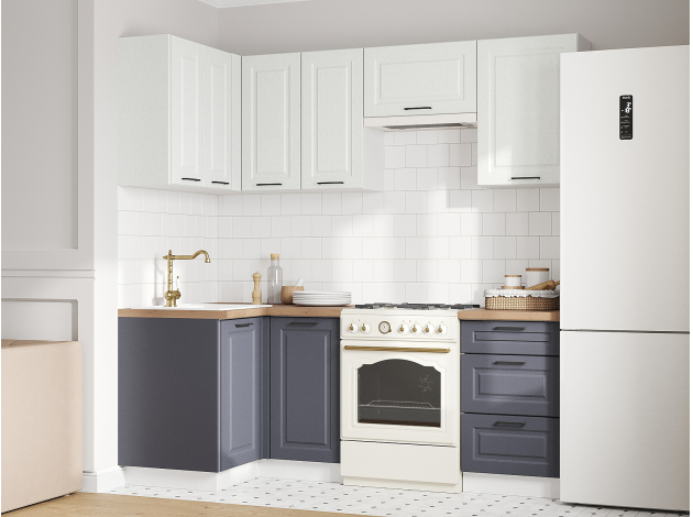 Кухонный гарнитур Грейвуд 210х100 см станет практичным приобретением на долгие годы. Продуманное расположение элементов позволяет создать комфортные условия для приготовления еды и соблюсти правило рабочего треугольника. Фрезеровка на фасадах и простые ручки в контрастном оттенке создают привлекательный облик мебели.