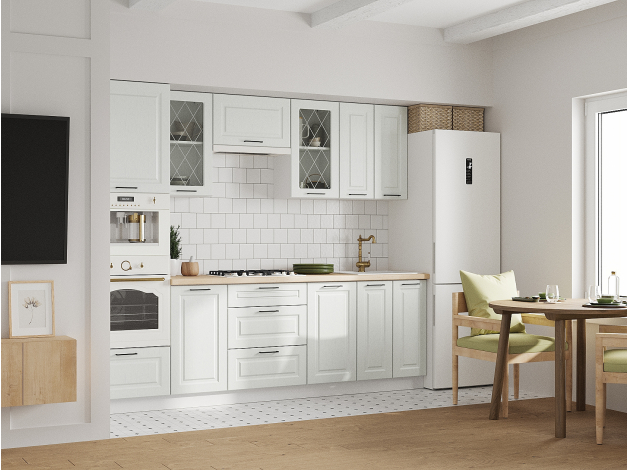 Кухонный гарнитур Грейвуд 260 см создаст пространство, где есть всё необходимое для размещения бытовой техники и различной утвари, а также комфортного приготовления пищи. Шкафы-витрины создают симметрию в интерьере и организуют зону для эстетичного хранения посуды. Контрастные детали в виде продолговатых ручек оживляют фасады, а древесная текстура наполняет обстановку уютом.