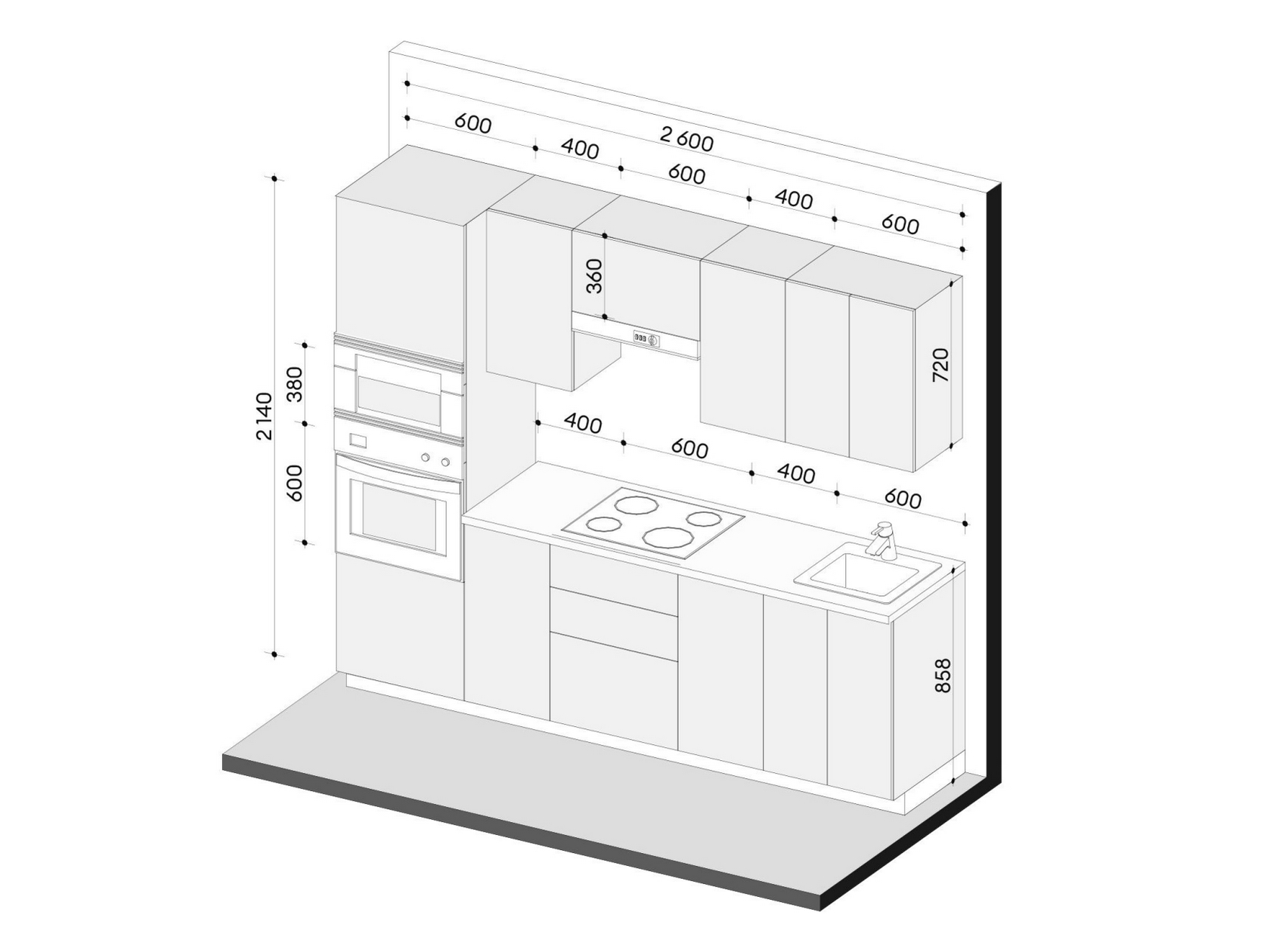 - Пенал под духовку и СВЧ: 214 х 60 х 56,2 см.