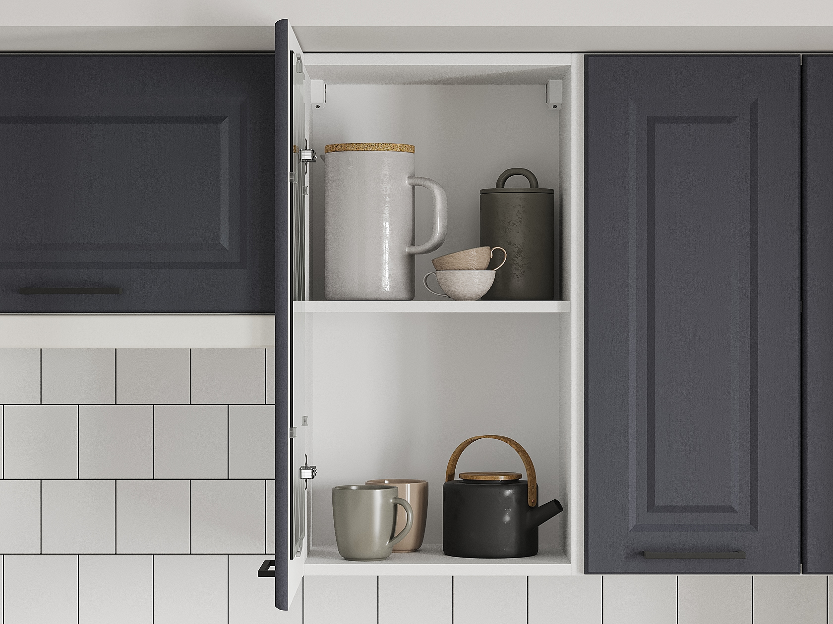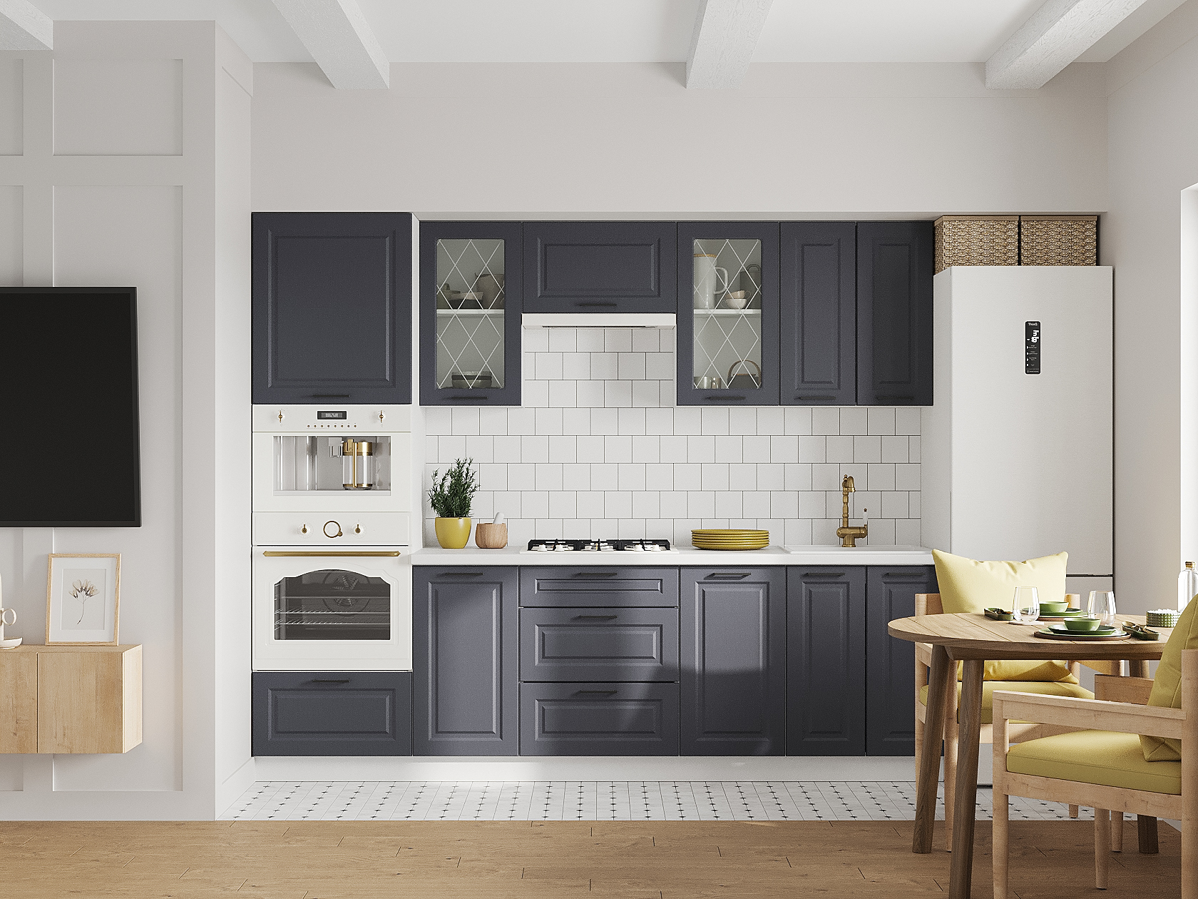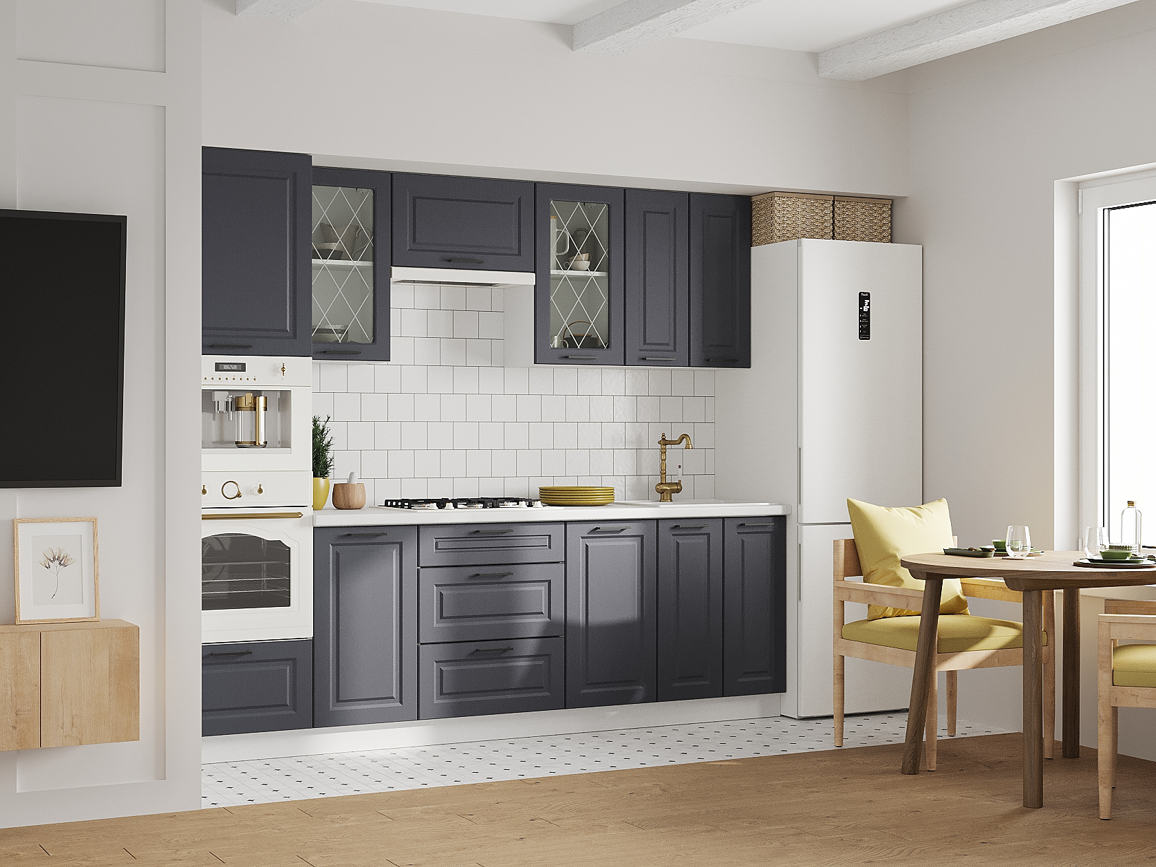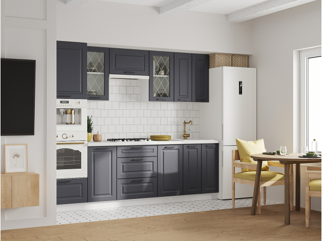 Кухонный гарнитур Грейвуд 260 см Белый / Шато индиго со стеклом