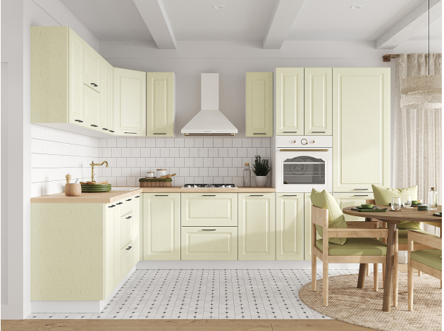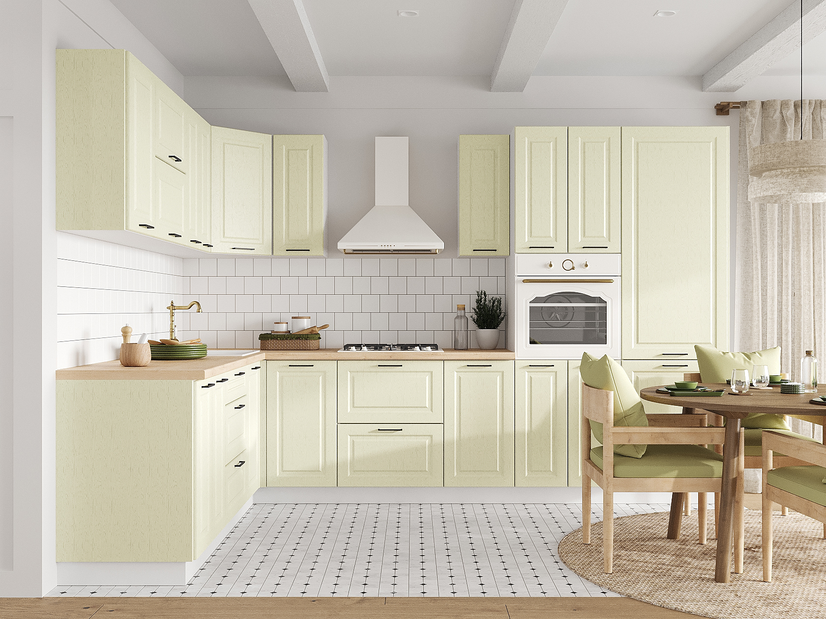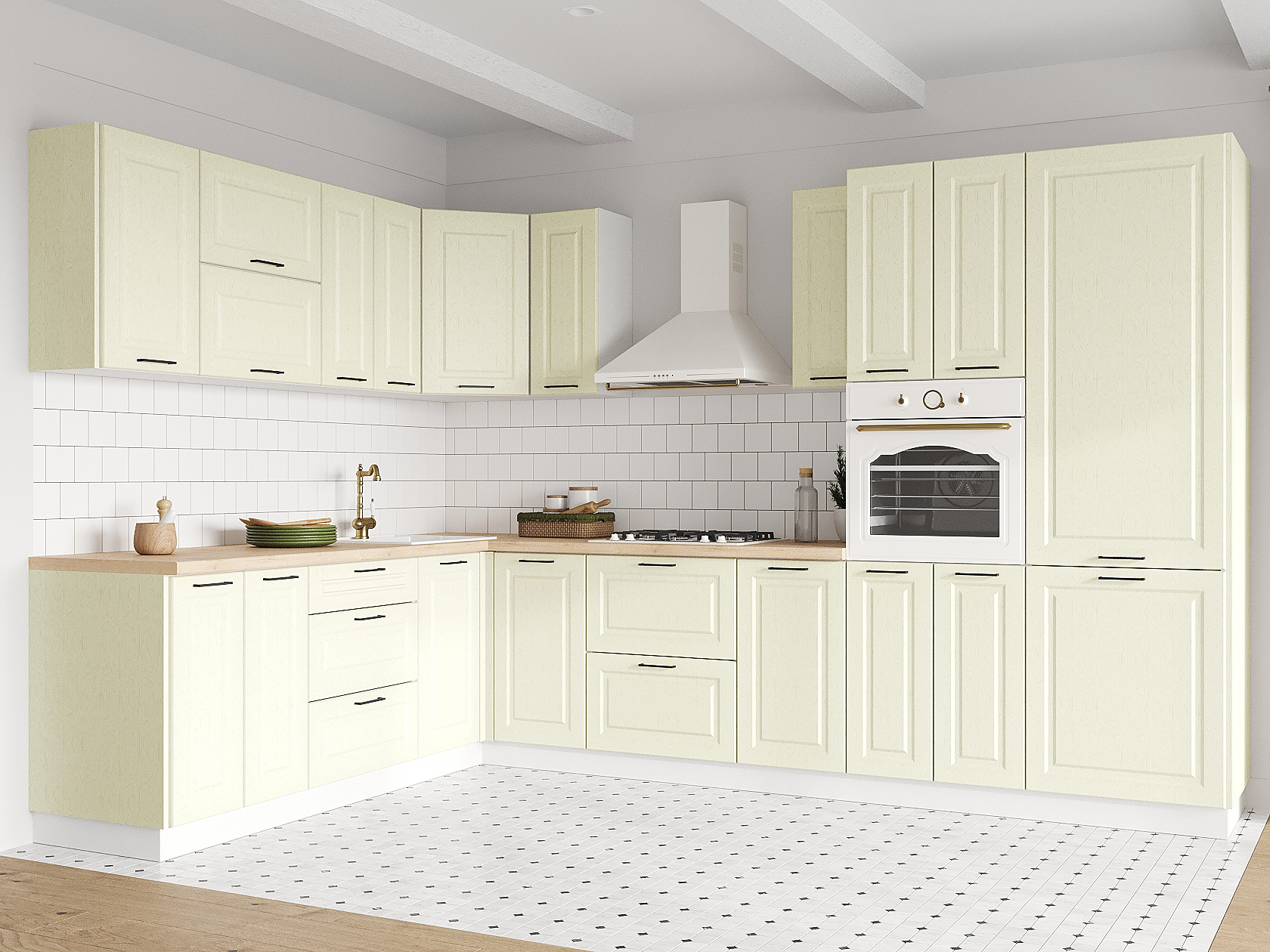 Кухонный гарнитур Грейвуд 320х220 см — вместительный и практичный набор для организации порядка. Угловая конструкция и расположение элементов позволяют соблюсти правило рабочего треугольника и создать комфортные условия для приготовления пищи. Матовые фасады, украшенные рамками, легко очищаются от загрязнений, что делает уход за мебелью простым и необременительным.