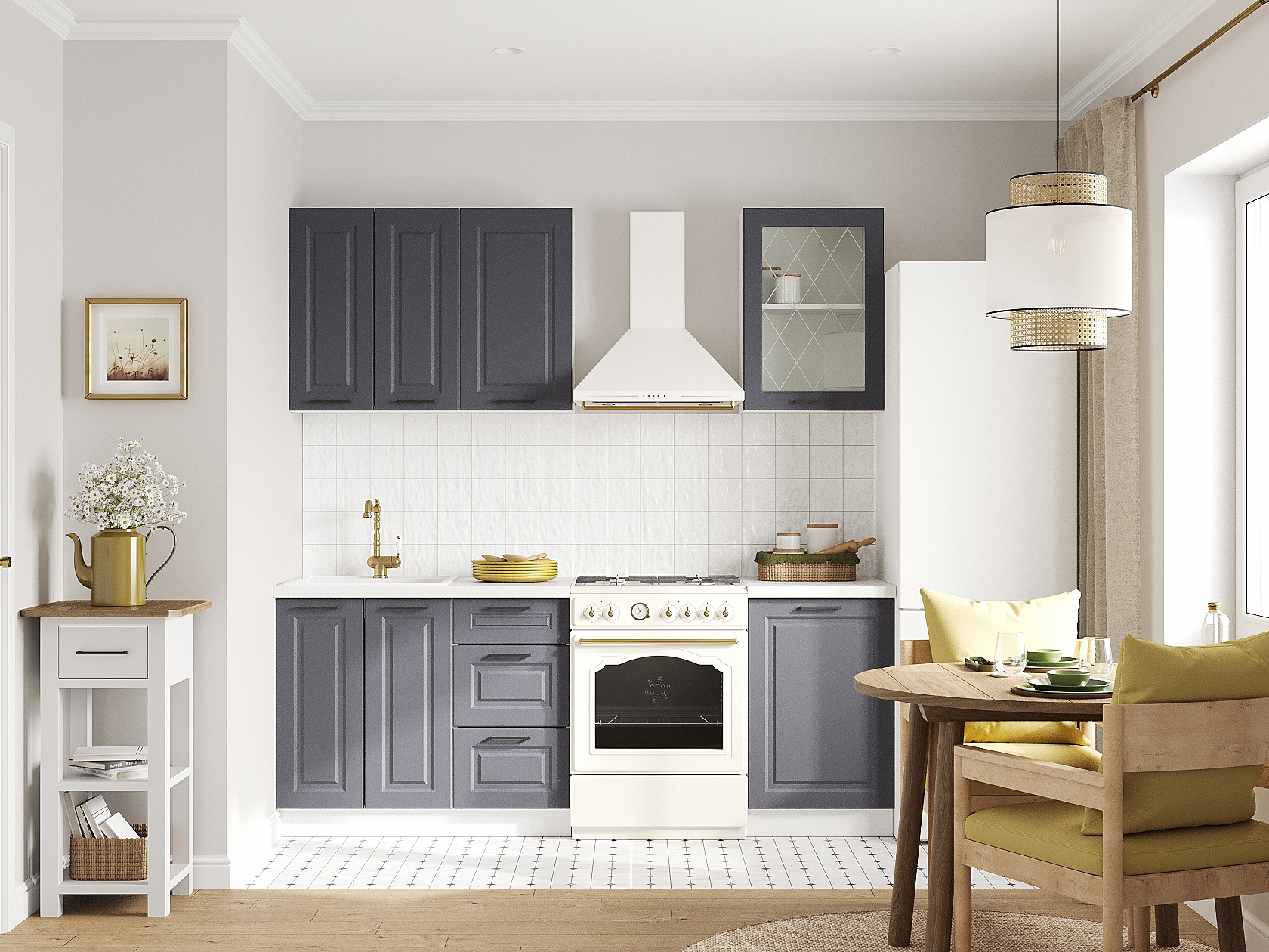 Кухонный гарнитур Грейвуд 150 см — оптимальный выбор для небольшой квартиры или дачи. Практичный набор элементов организует компактное хранение посуды и продуктов. В оформлении фасадов использована фрезеровка в виде простых рамок, а также строгие геометричные ручки контрастного оттенка. Шкаф-витрина с ромбовидным узором на стекле создает привлекательный акцент в интерьере.