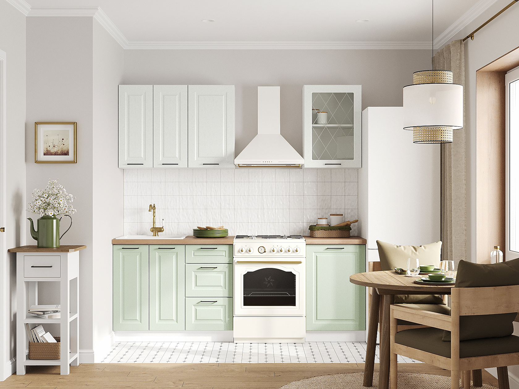 Кухонный гарнитур Грейвуд 150 см — оптимальный выбор для небольшой квартиры или дачи. Практичный набор элементов организует компактное хранение посуды и продуктов. В оформлении фасадов использована фрезеровка в виде простых рамок, а также строгие геометричные ручки контрастного оттенка. Шкаф-витрина с ромбовидным узором на стекле создает привлекательный акцент в интерьере.