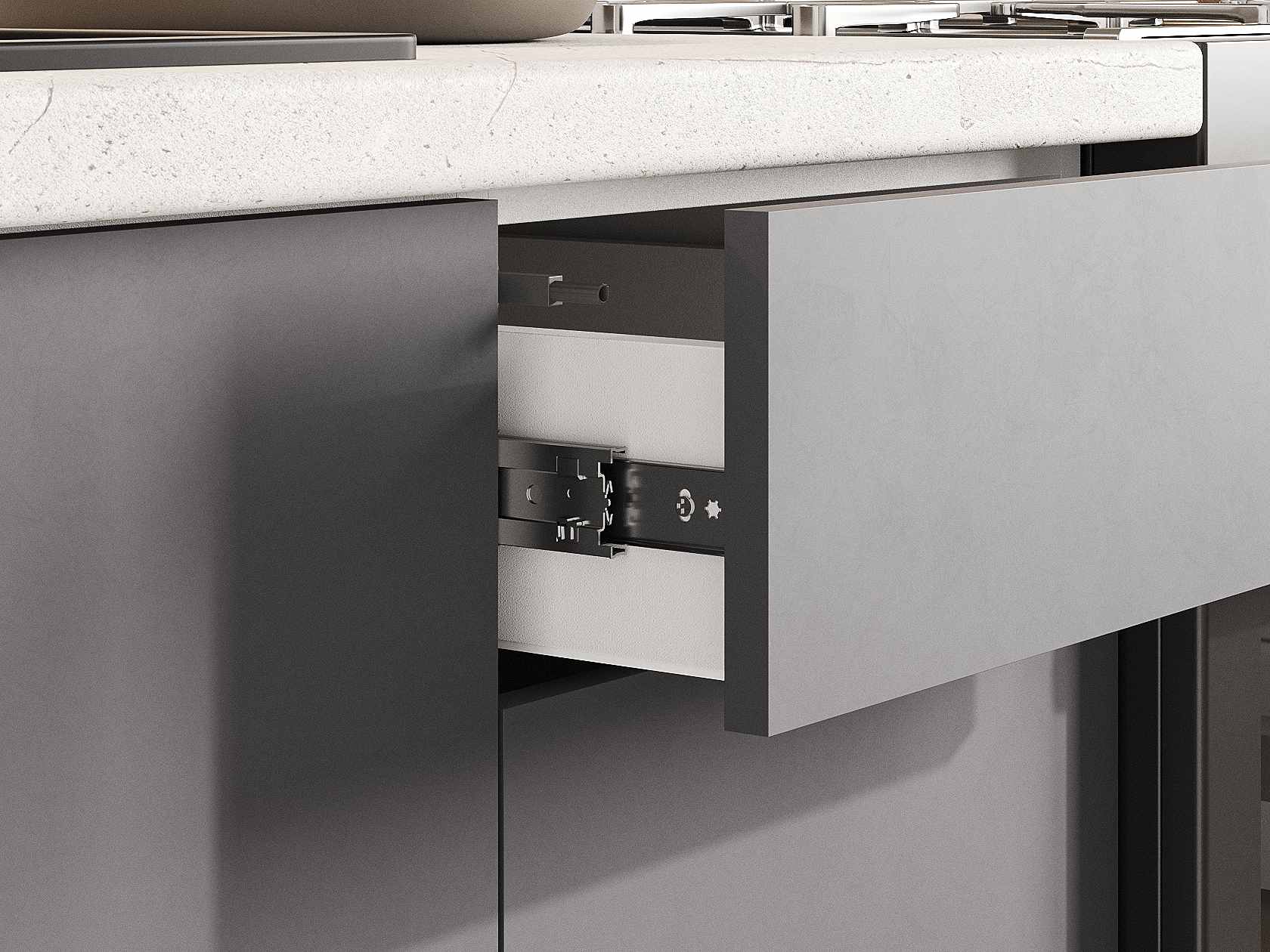 - Направляющие ящиков: шариковые.