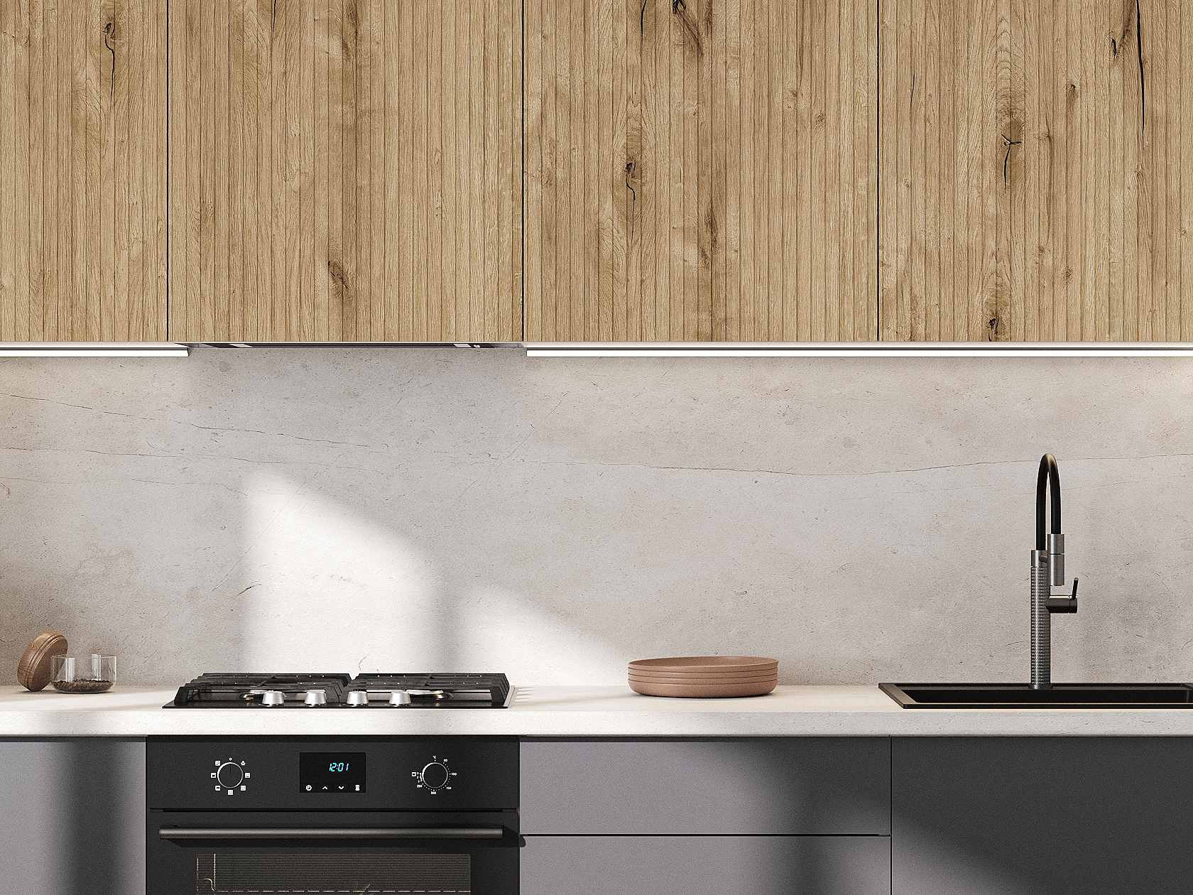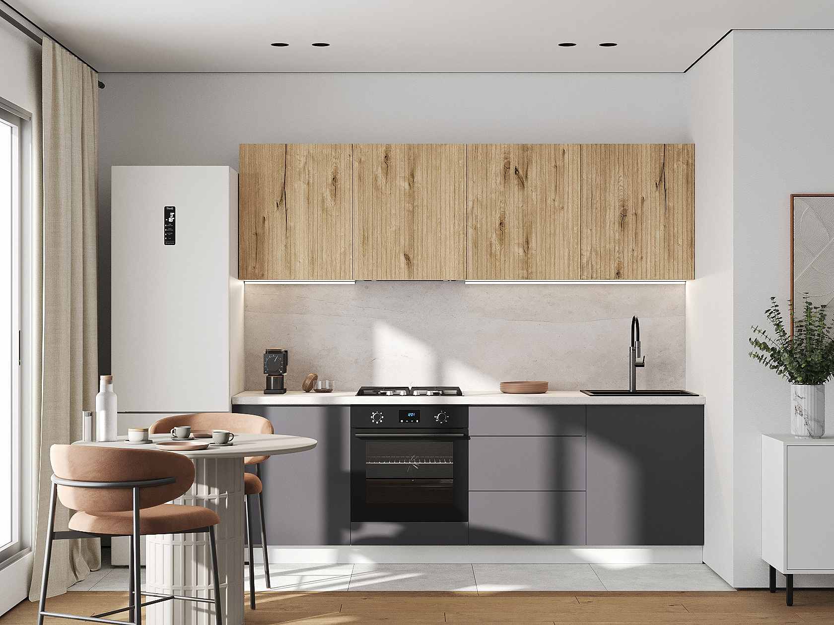 Кухонный гарнитур Комби 240 см — готовое решение для оформления современного интерьера с удобной системой хранения. Мебель и технику можно расположить вдоль одной стены, тем самым разместив под рукой всё необходимое для приготовления пищи. Верхний ряд шкафов послужит акцентом благодаря вертикальной фрезеровке, а нижний — зрительно увеличит пространство благодаря однотонным фасадам.