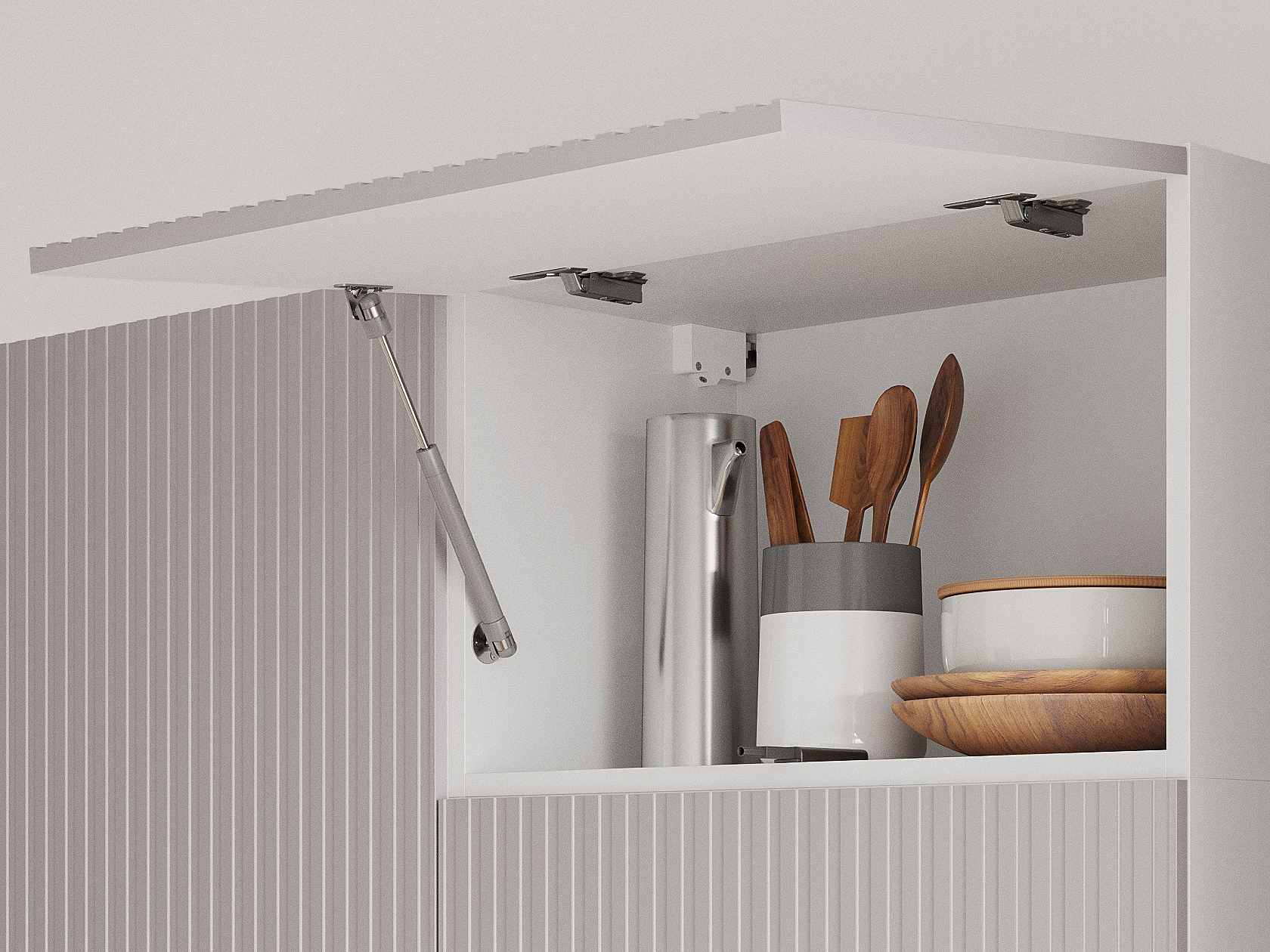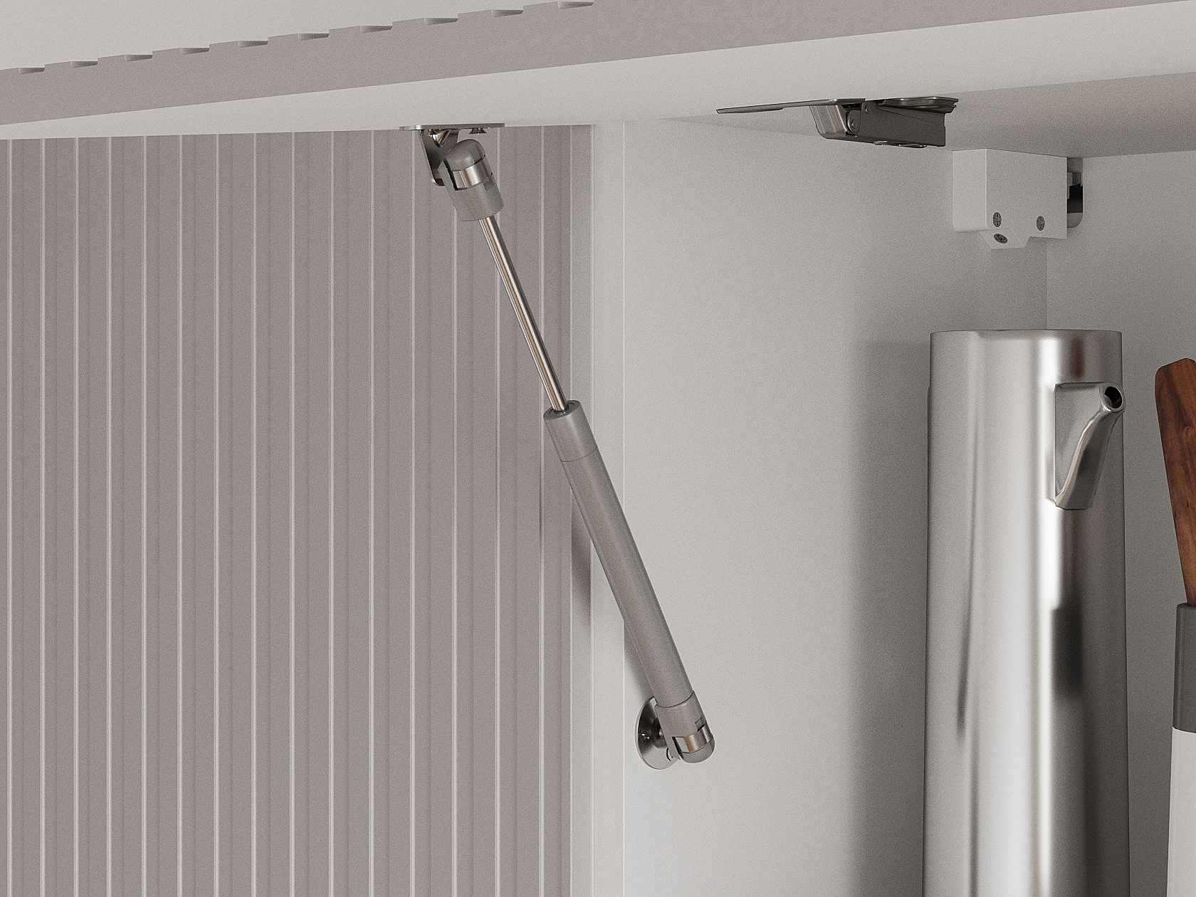 - Фурнитура дверей антресольных шкафов: подъемник с газовым кронштейном.