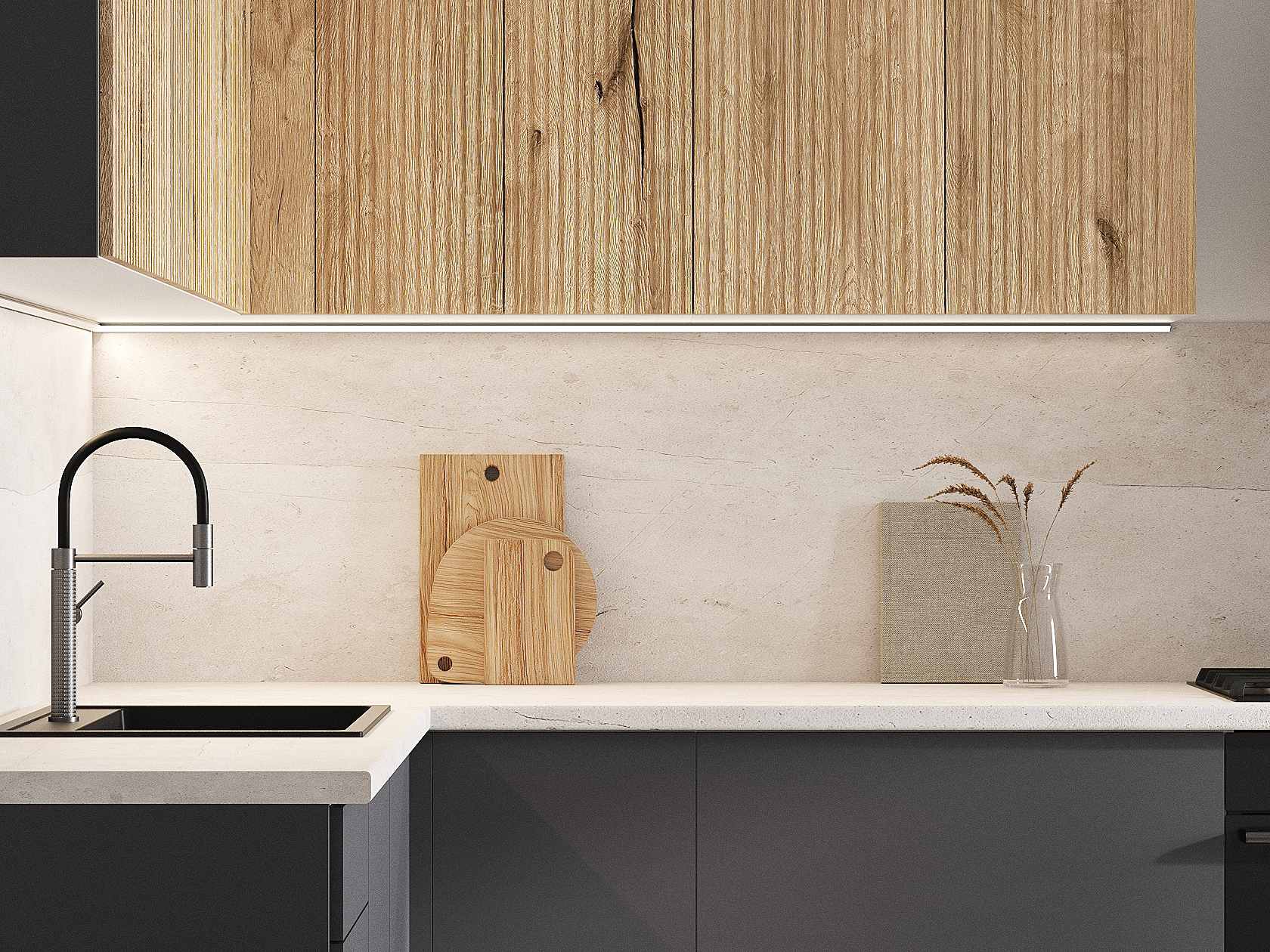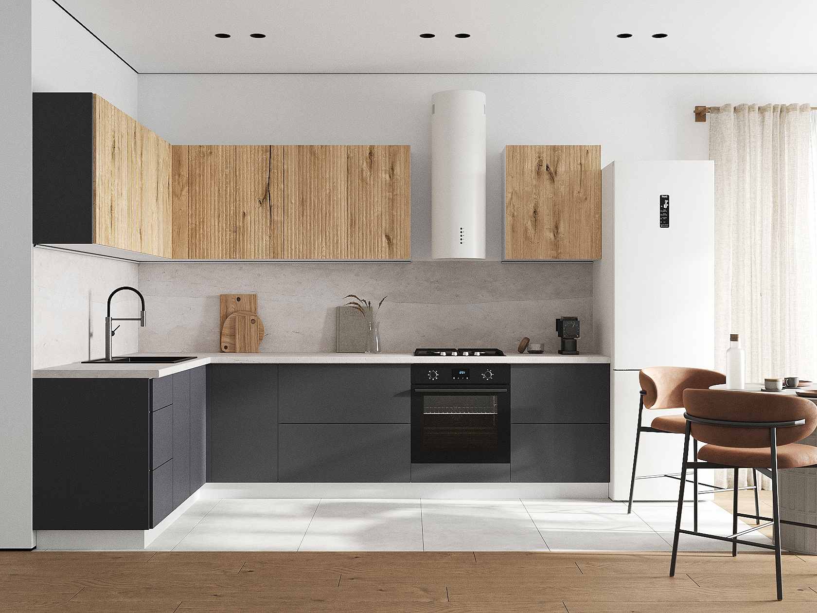 Кухонный гарнитур Комби 300х180 см Белый / Дуб Торонто / Графит