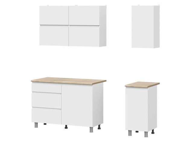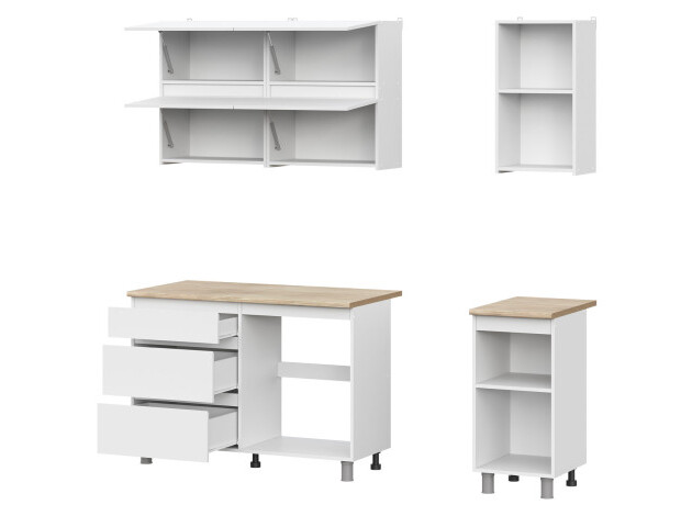 Кухонный гарнитур Киото — готовое решение для создания светлого и визуально легкого интерьера. Дверцы ящиков и шкафов не имеют лицевой фурнитуры и открываются захватом рукой за тыльный край фасада, что смотрится современно и упрощает уход за поверхностью. Столешница в оттенке натурального дерева делает гарнитур уютнее, а регулируемые опоры помогают справиться с небольшими неровностями пола.
