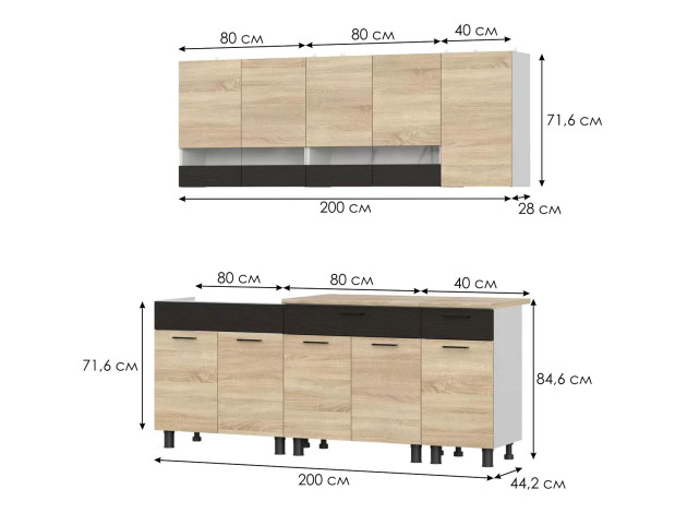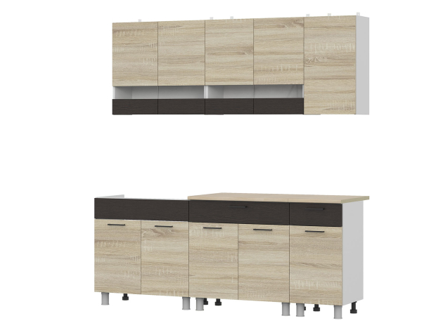 Кухонный гарнитур Кайган 200 см в лаконичном исполнении с преобладанием строгих форм и прямых линий станет отличным решением для обустройства небольшого современного помещения. Компактные функциональные элементы помогут хранить в легком доступе необходимые посуду и кухонную утварь. Высокие опоры облегчат уборку.
