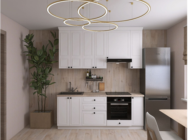 Кухонный гарнитур Бьянка 210 см создаст уютную атмосферу и поможет организовать удобное пространство для приготовления пищи. Белые фасады с тонкими рамками дополнены акцентными ручками. Такое оформление смотрится очень элегантно, при этом не перегружает интерьер. В гарнитуре есть всё необходимое для хранения посуды, продуктов и разной утвари, а также установки встраиваемой техники.