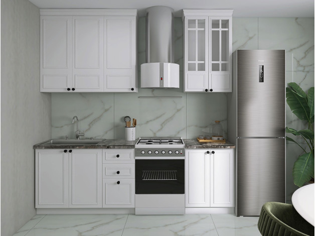 Кухонный гарнитур Бьянка 240 см станет выигрышным вариантом для небольших помещений. Элементы образуют вместительную систему хранения с удобной зоной приготовления. Светлые фасады дарят ощущение простора и комфорта, а изящные рамки и акцентные ручки придают мебели по-настоящему элегантный вид. На такой кухне легко поддерживать порядок и приятно готовить.