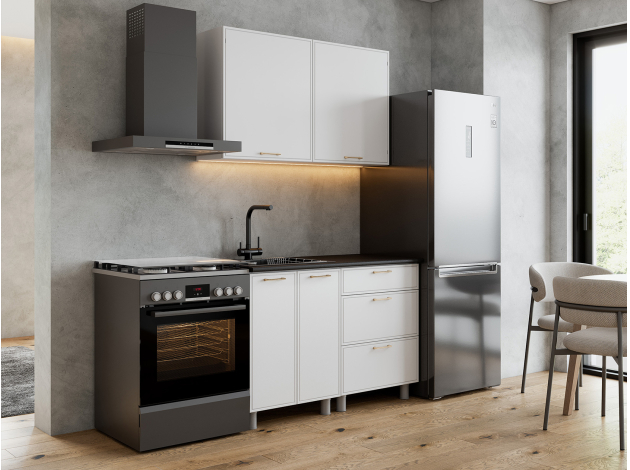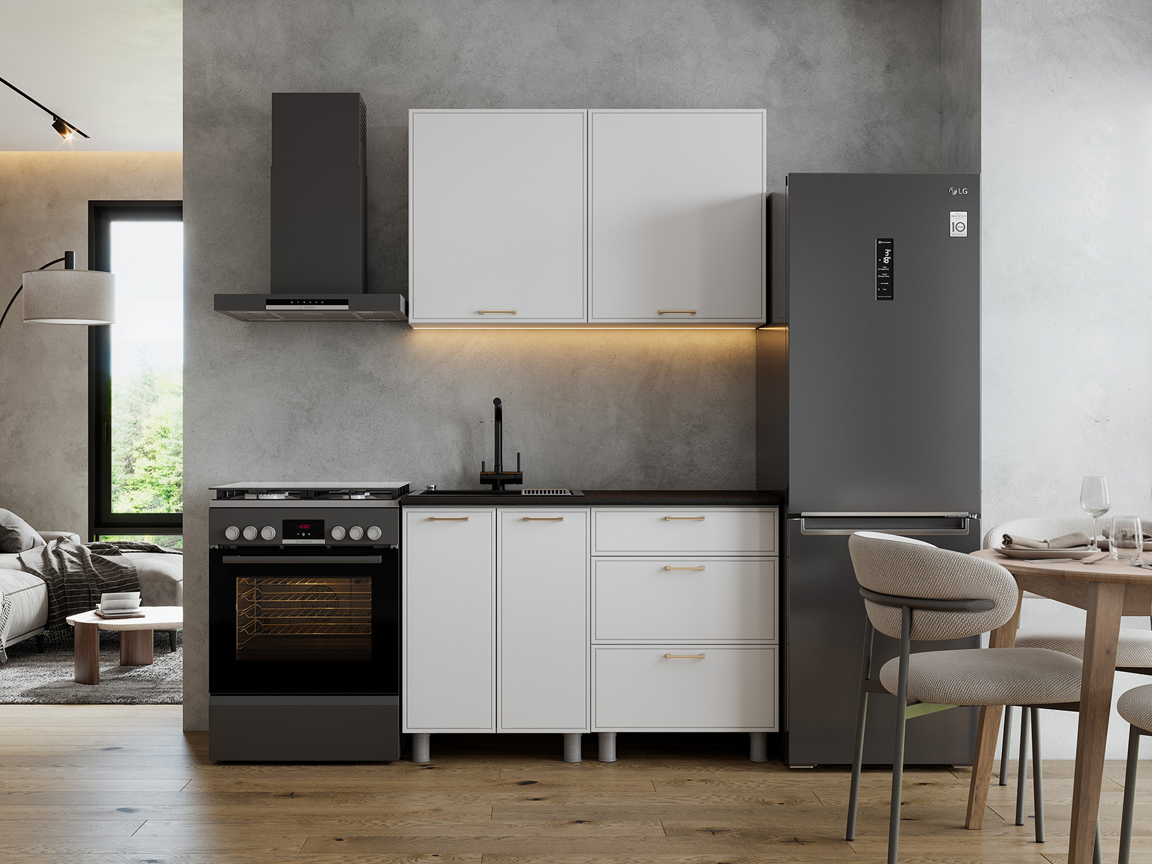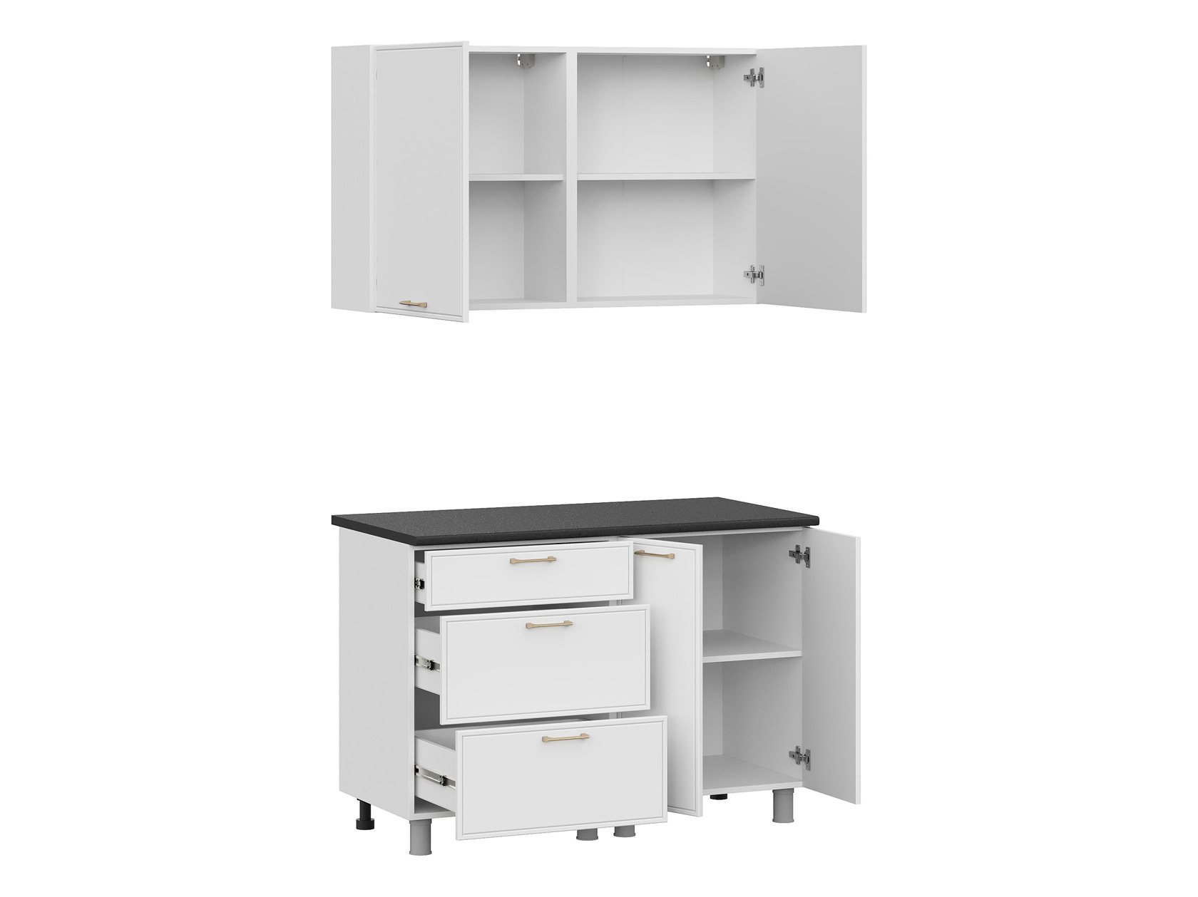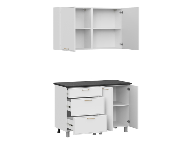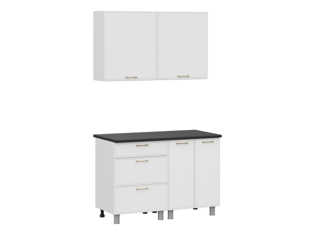 Кухонный гарнитур Квадро 120 см сочетает стильный современный дизайн и функциональность. Внутри предусмотрены полки и ящики для удобного хранения различной утвари и продуктов. Матовые фасады украшены лаконичными рамками. Такой дизайн не перегружает интерьер. Благодаря регулируемым опорам модули устойчивы даже на полу с небольшими неровностями.