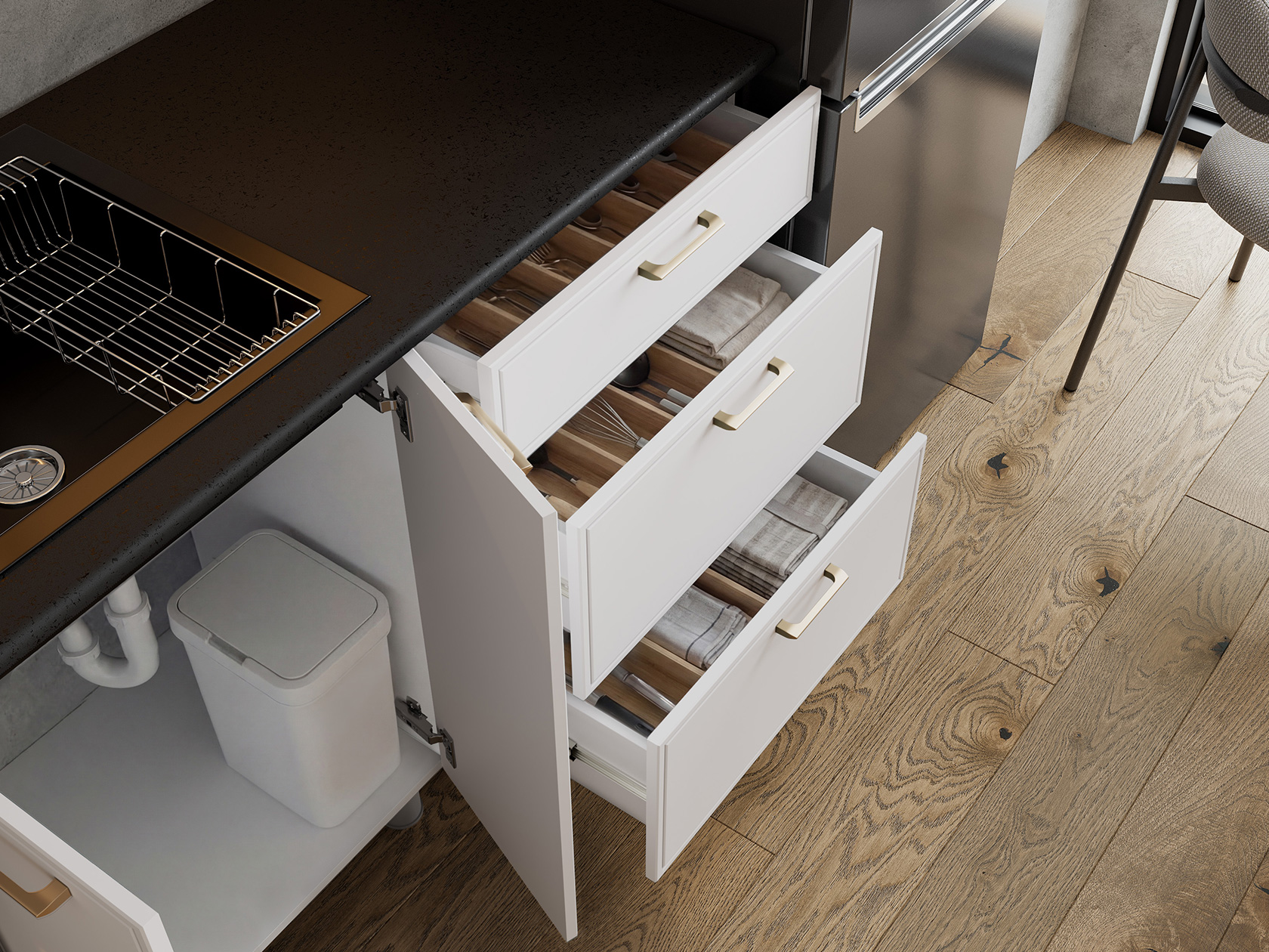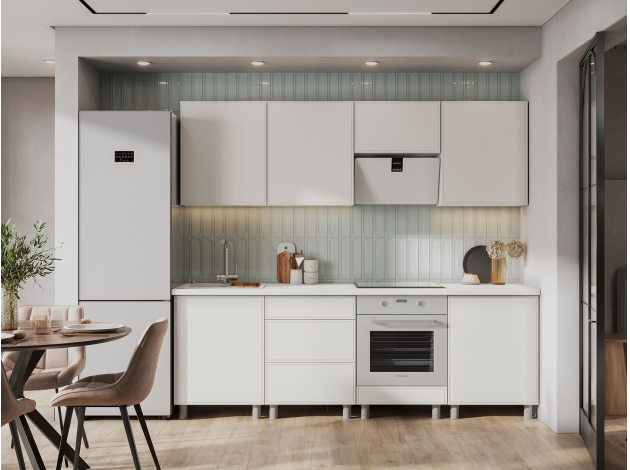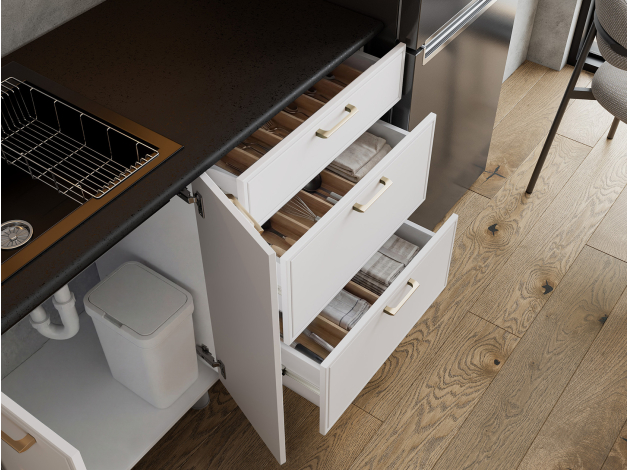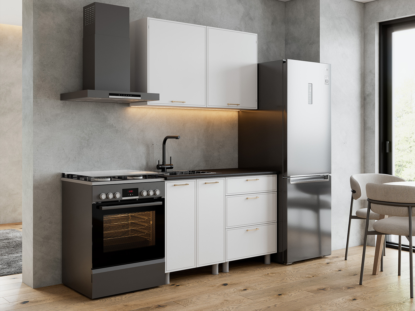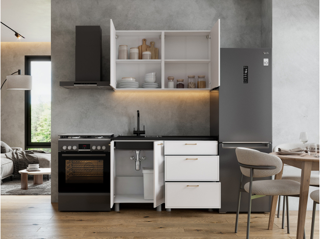 Кухонный гарнитур Квадро 120 см сочетает стильный современный дизайн и функциональность. Внутри предусмотрены полки и ящики для удобного хранения различной утвари и продуктов. Матовые фасады украшены лаконичными рамками. Такой дизайн не перегружает интерьер. Благодаря регулируемым опорам модули устойчивы даже на полу с небольшими неровностями.