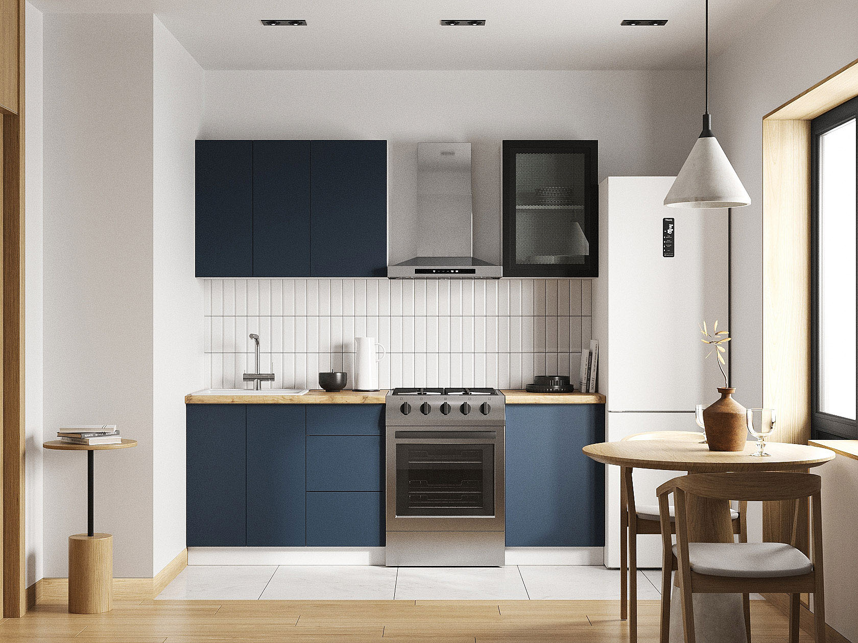 Кухонный гарнитур Модерн 150 см — готовое решение для небольшой квартиры или студии. Компактный набор элементов организует порядок и создаст аккуратный интерьер. Верхний ряд украшает шкаф-витрина, а выдвижные ящики позволяют быстро находить столовые приборы и другие принадлежности. Фасады без лицевой фурнитуры подчеркивают лаконичный дизайн мебели.
