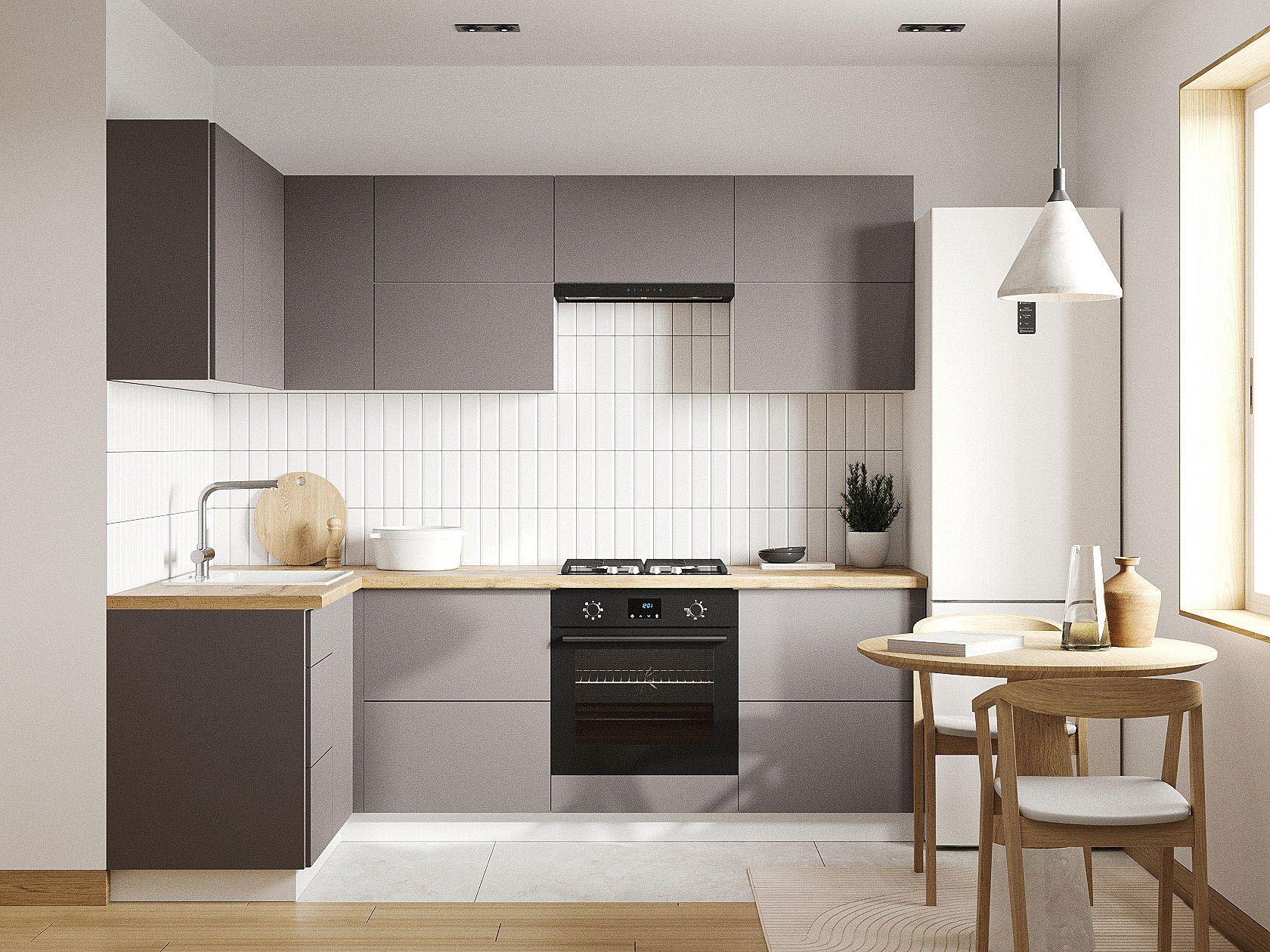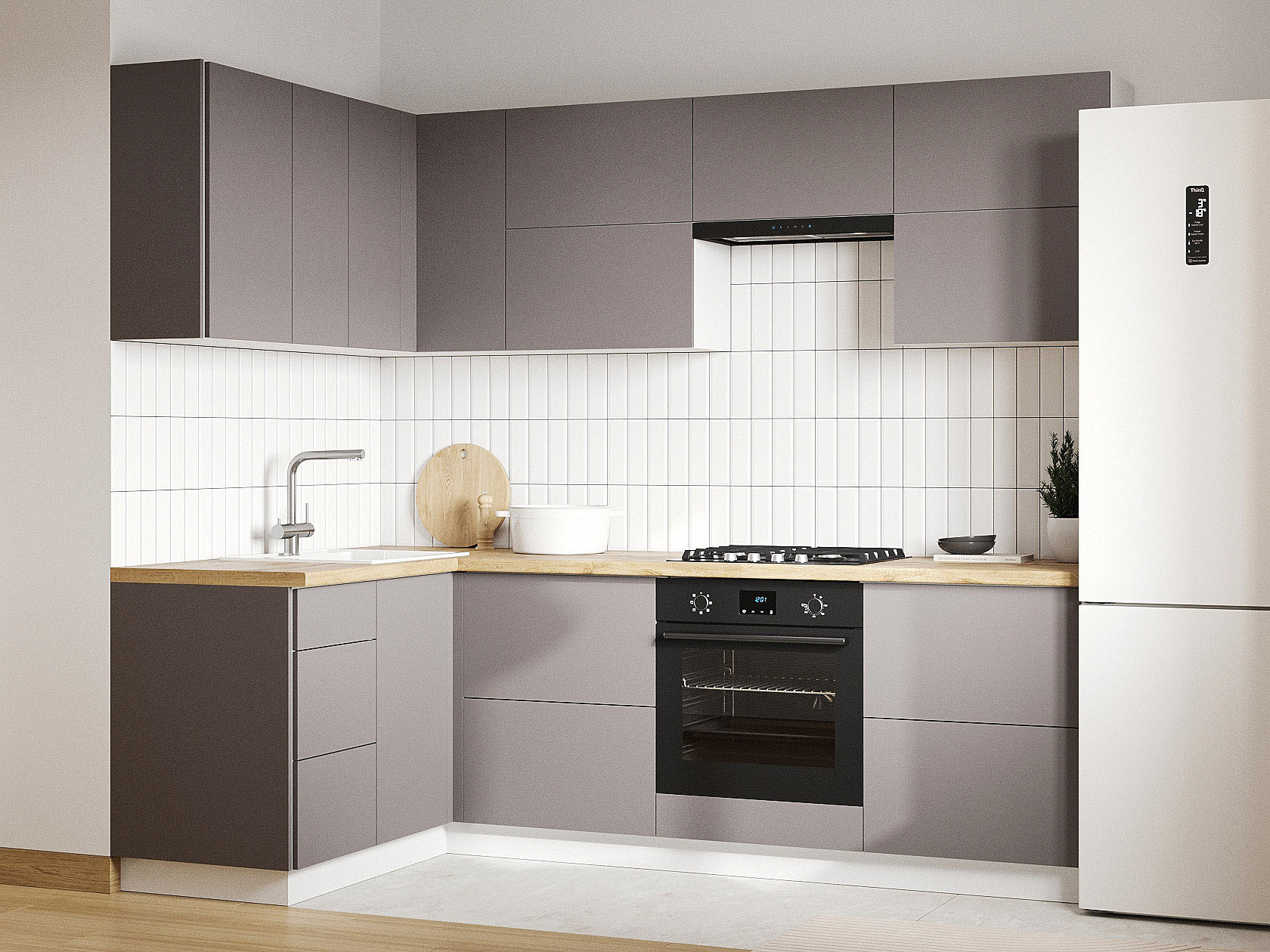 Кухонный гарнитур Модерн 240х140 см станет практичным приобретением на долгие годы. Конфигурация элементов позволяет создать комфортные условия для приготовления пищи и соблюсти правило рабочего треугольника. За фасадами легко ухаживать, а отсутствие ручек поддерживает тренд на лаконичность.