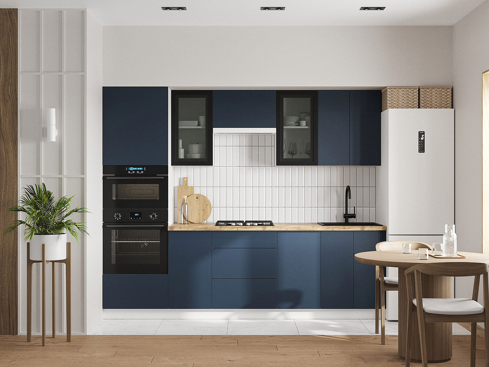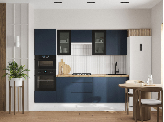 Кухонный гарнитур Модерн 260 см создаст вместительную систему хранения с удобно расположенной техникой и комфортной рабочей зоной. В дизайне нет ничего лишнего, а узор на стеклянных дверцах добавляет обстановке симметрию и строгость. Благодаря продуманному наполнению и качественной фурнитуре пользоваться мебелью легко и приятно.