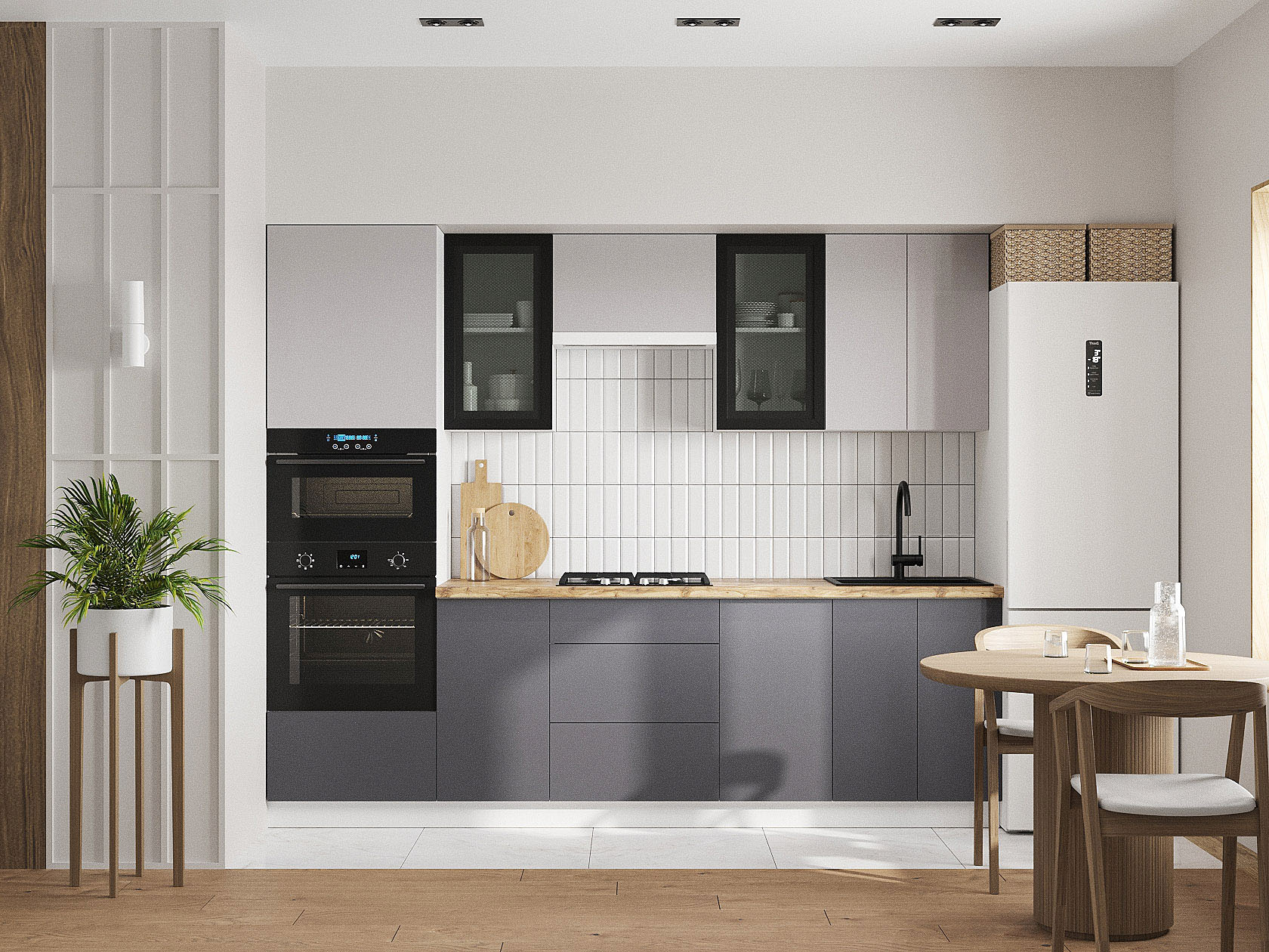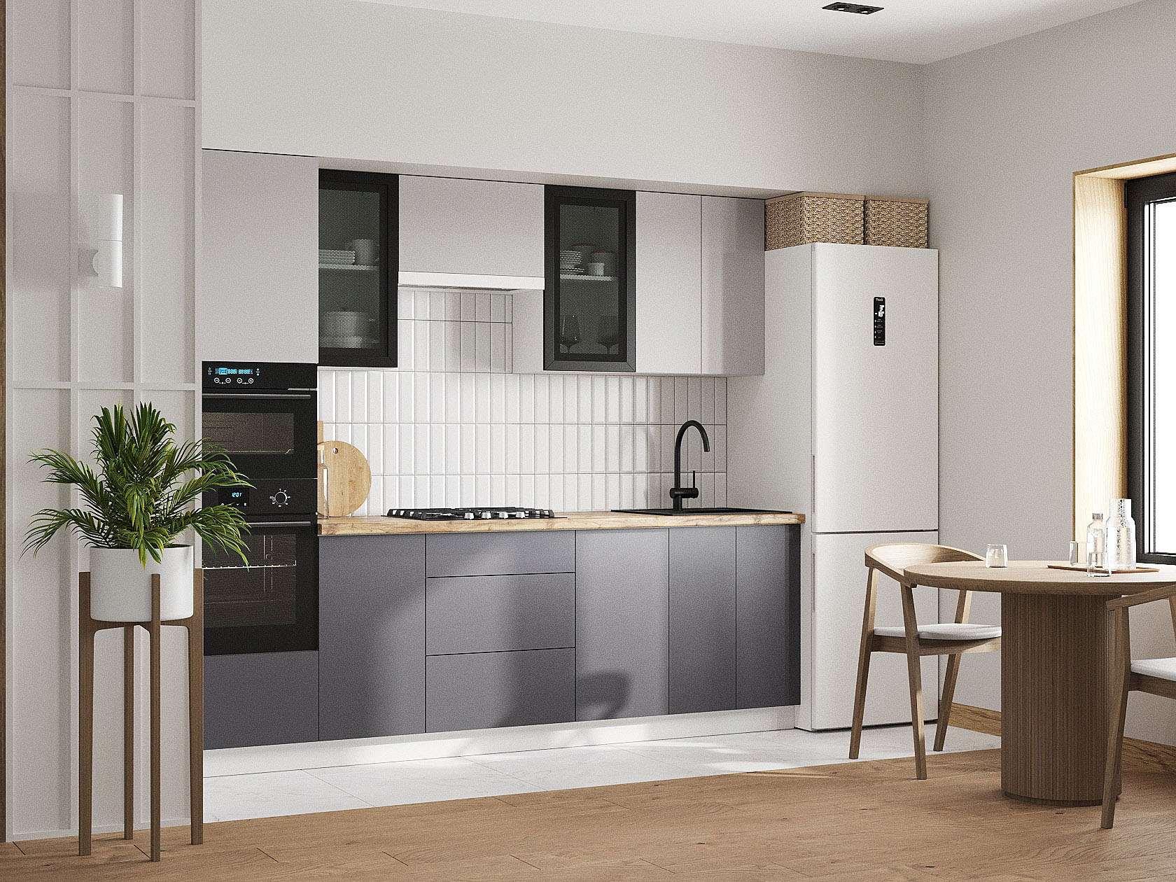 Кухонный гарнитур Модерн 260 см создаст вместительную систему хранения с удобно расположенной техникой и комфортной рабочей зоной. В дизайне нет ничего лишнего, а узор на стеклянных дверцах добавляет обстановке симметрию и строгость. Благодаря продуманному наполнению и качественной фурнитуре пользоваться мебелью легко и приятно.