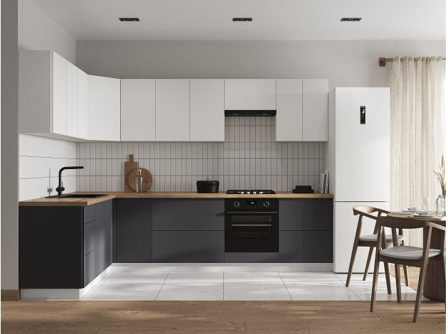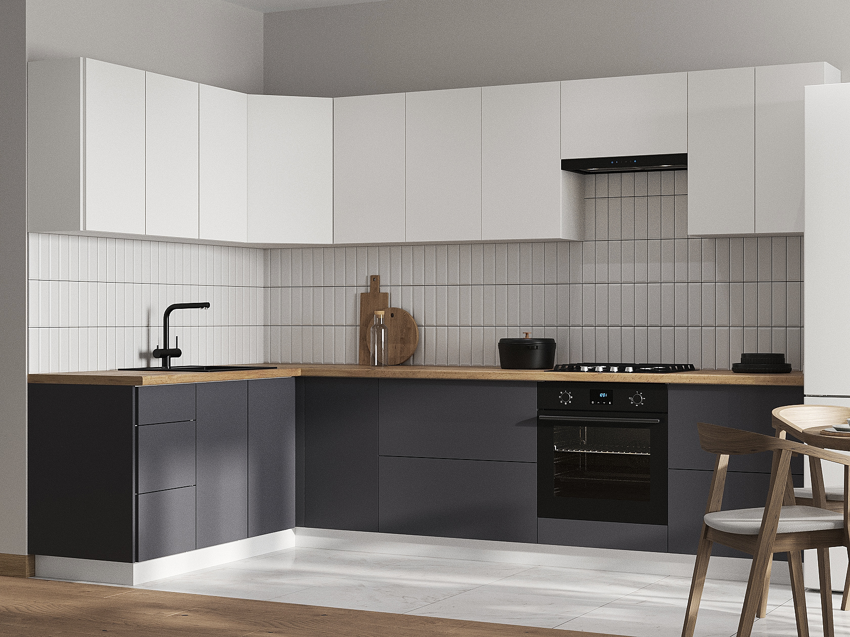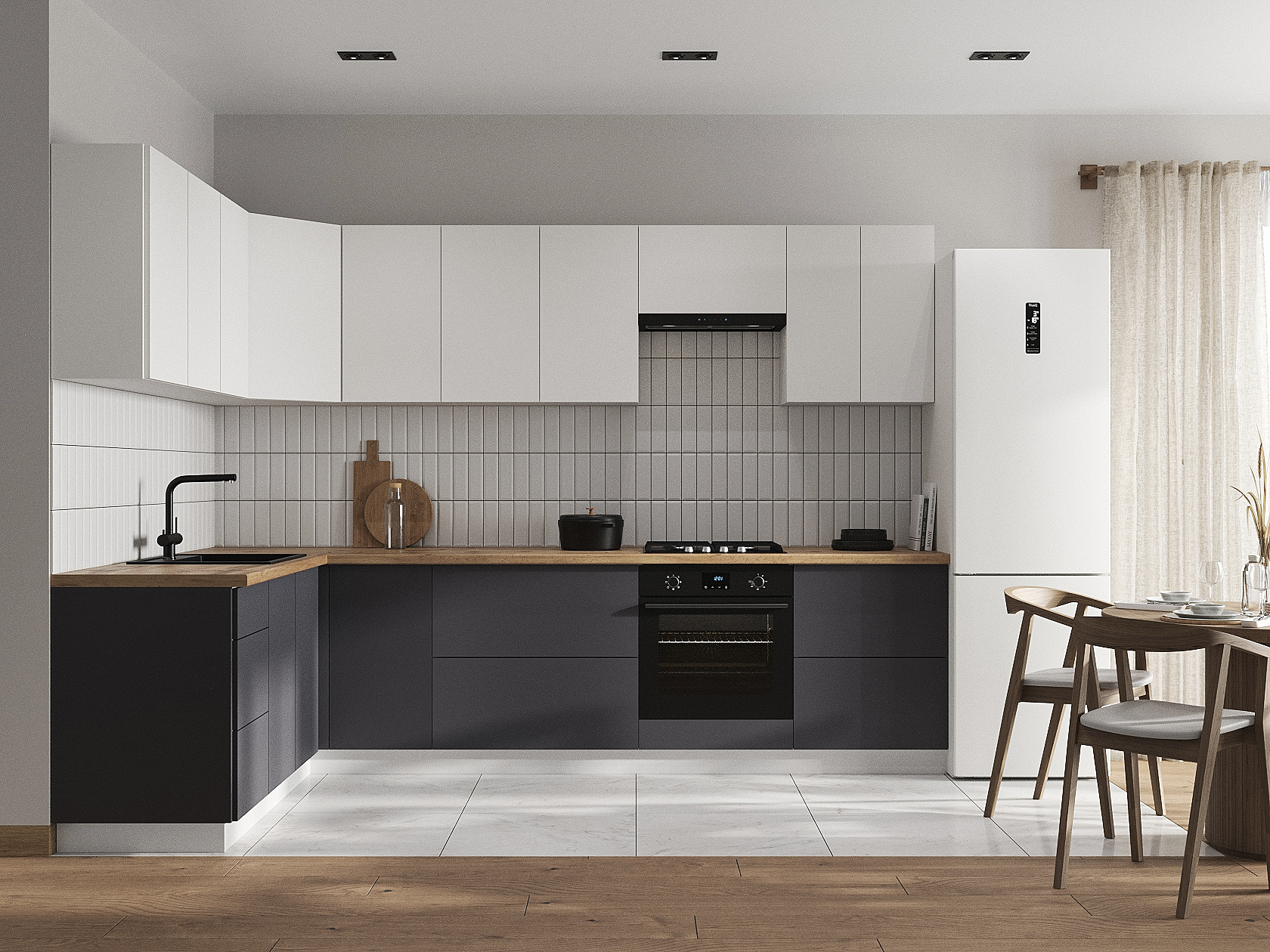 Кухонный гарнитур Модерн 300х180 см — идеальное решение, чтобы обустроить пространство для готовки в большой квартире. Здесь всё продумано для хранения посуды, продуктов и различной утвари. Фасады непритязательны в уходе, а цоколь защищает мебель от попадания мусора под основание.