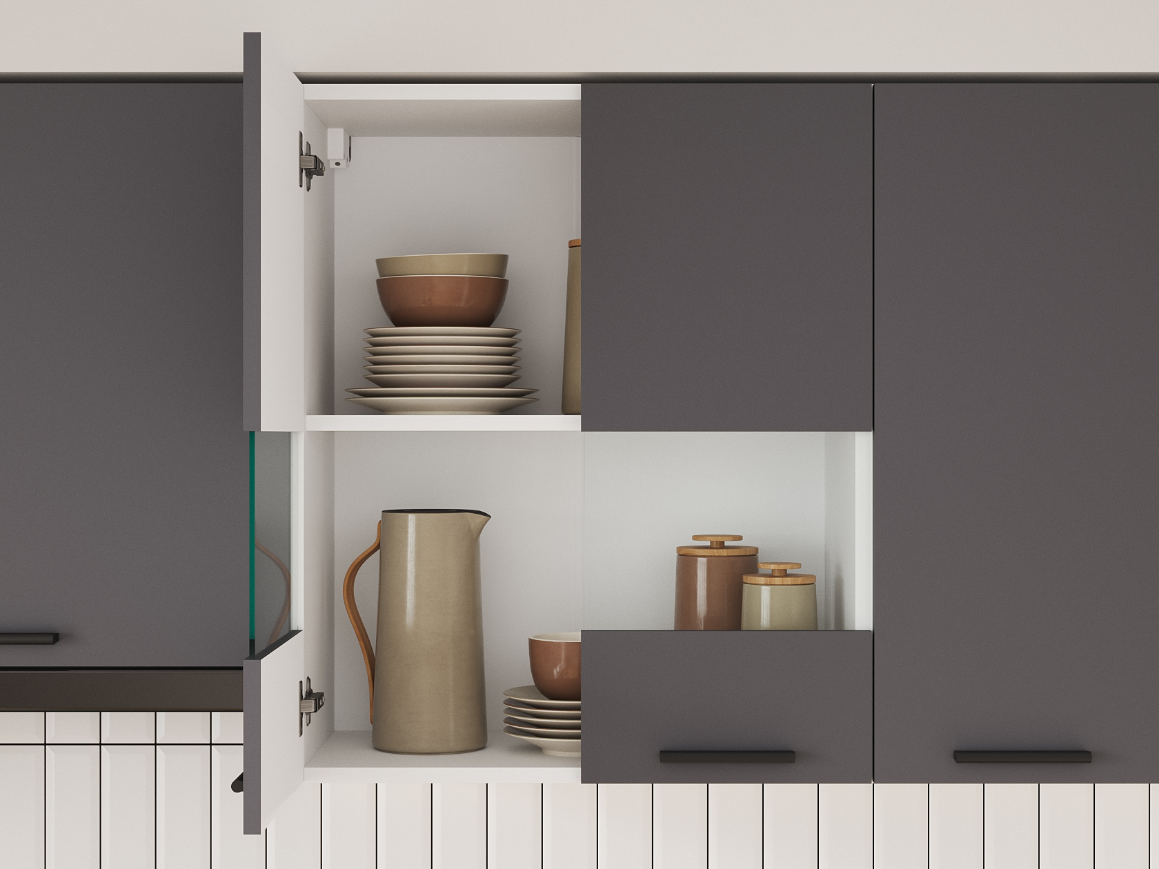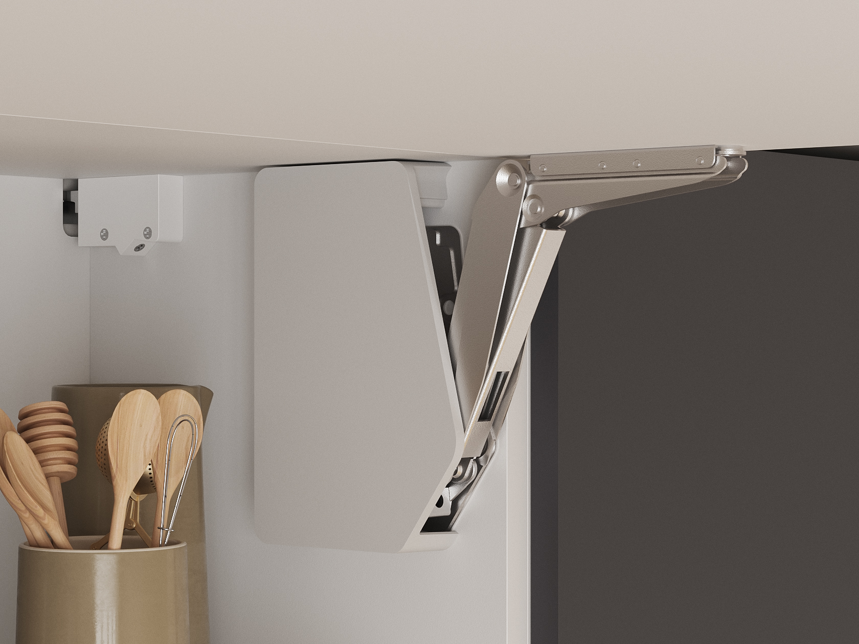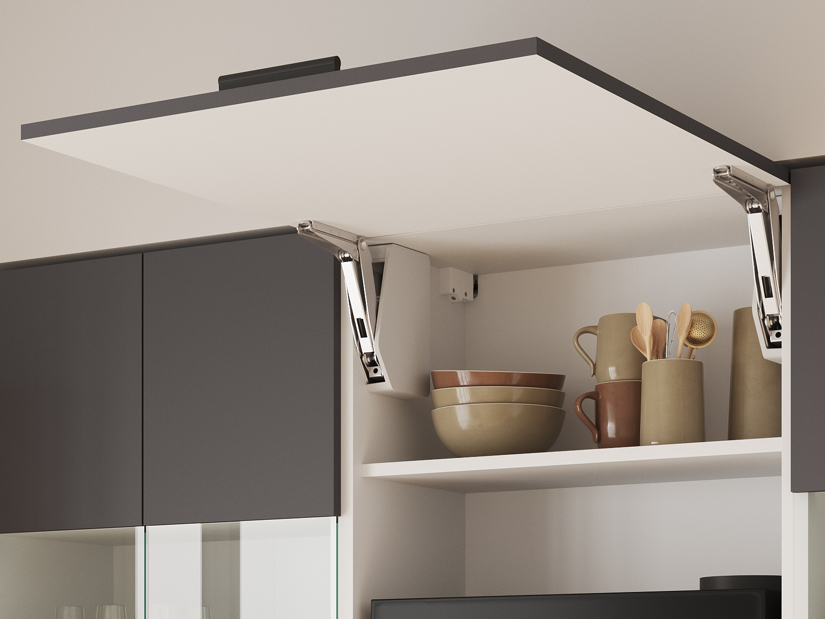 - Фурнитура дверцы шкафа под вытяжку: подъемник с газовым кронштейном.