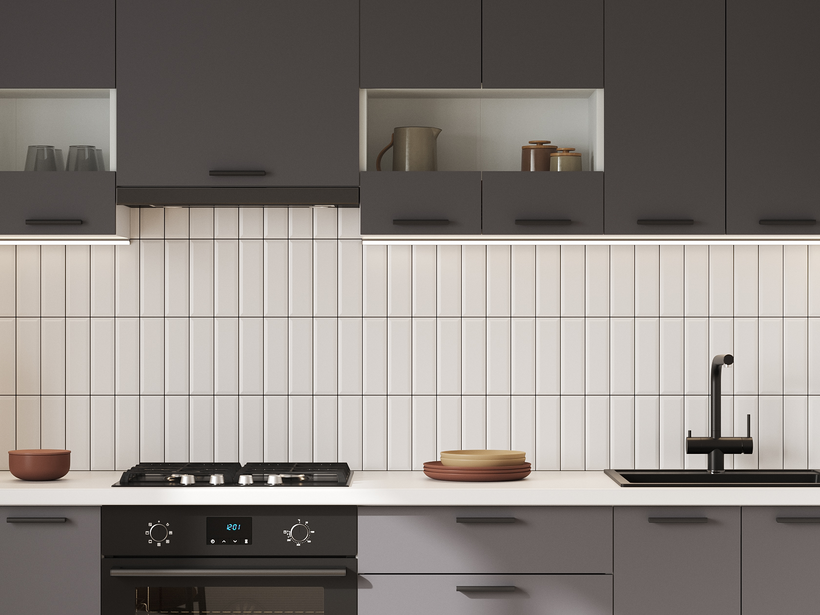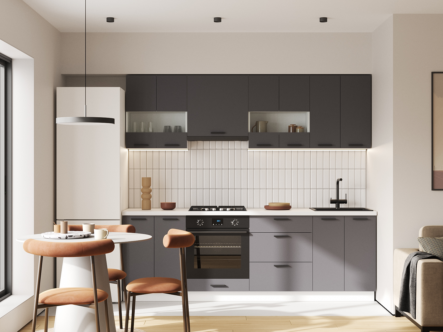 Кухонный гарнитур Модус 240 см со стеклом поможет организовать вместительную систему хранения с удобно расположенной техникой и комфортной рабочей зоной. В дизайне мебели нет ничего лишнего. Ровные линии и выверенные пропорции добавляют обстановке симметрию и строгость. Продуманное наполнение позволяет держать под рукой необходимую утварь и продукты.