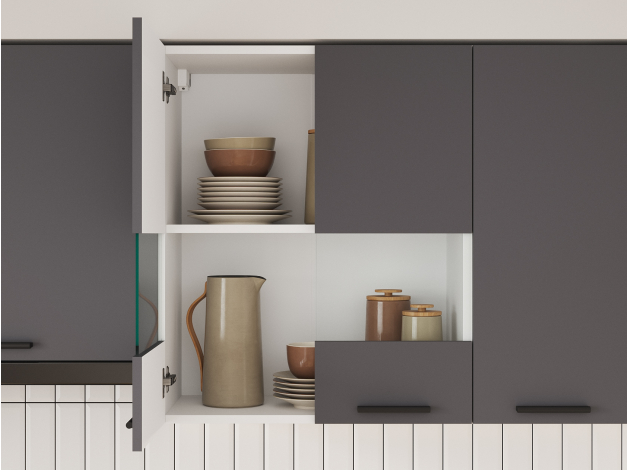 Фасады с внутренней стороны имеют базовые несквозные отверстия под ручки 12,8 см, при желании, можно установить ручки другого размера, просверлив отверстия на фасаде по месту.