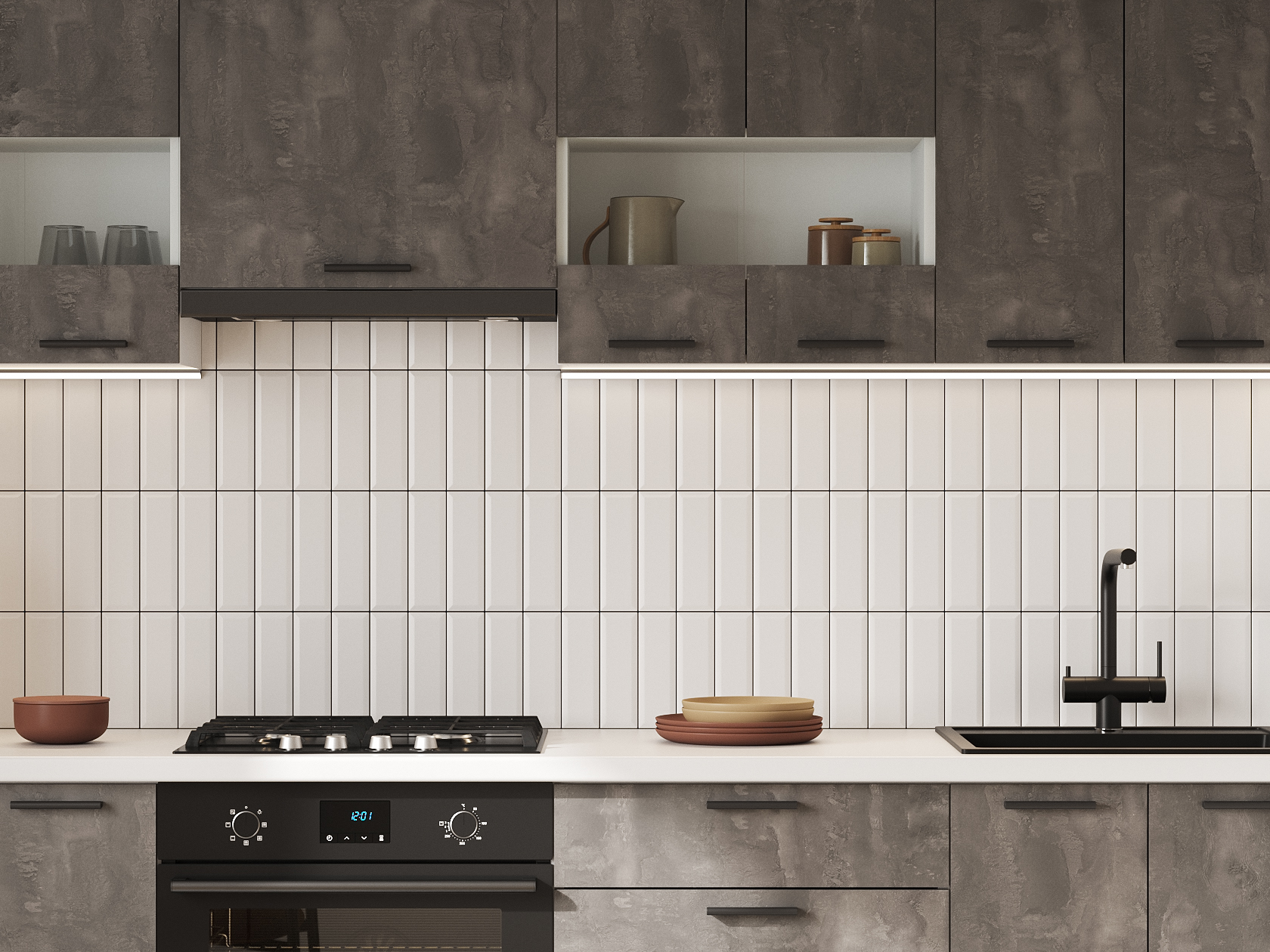 Кухонный гарнитур Модус 240 см со стеклом Белый / Камень темный со стеклом