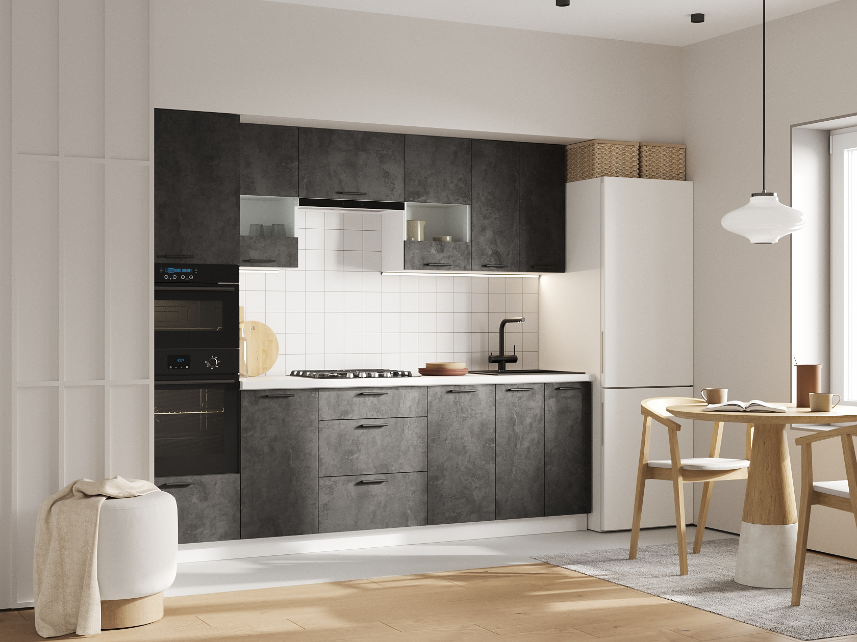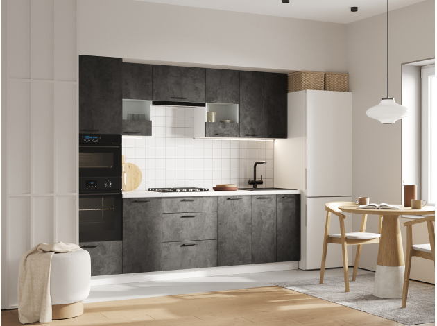 Кухонный гарнитур Модус 260 см со стеклом Белый / Цемент темный со стеклом