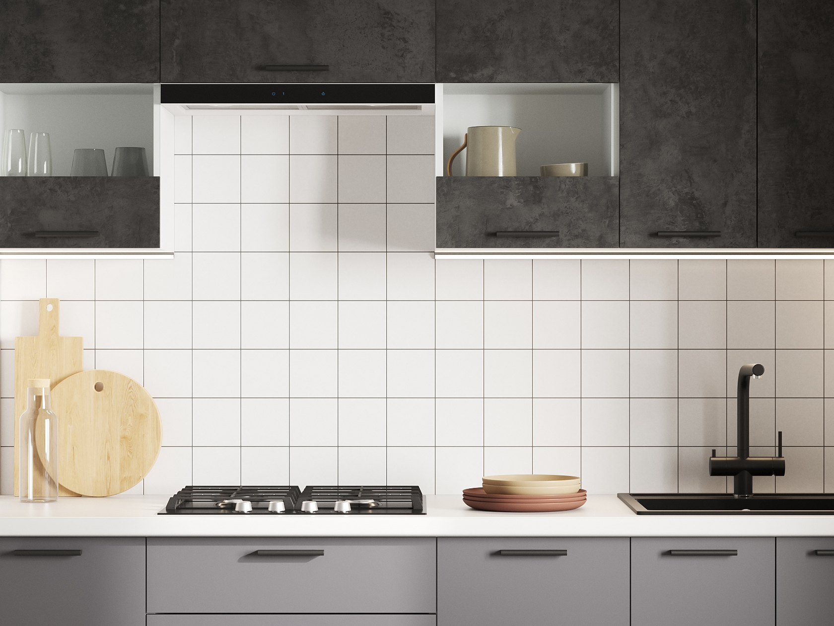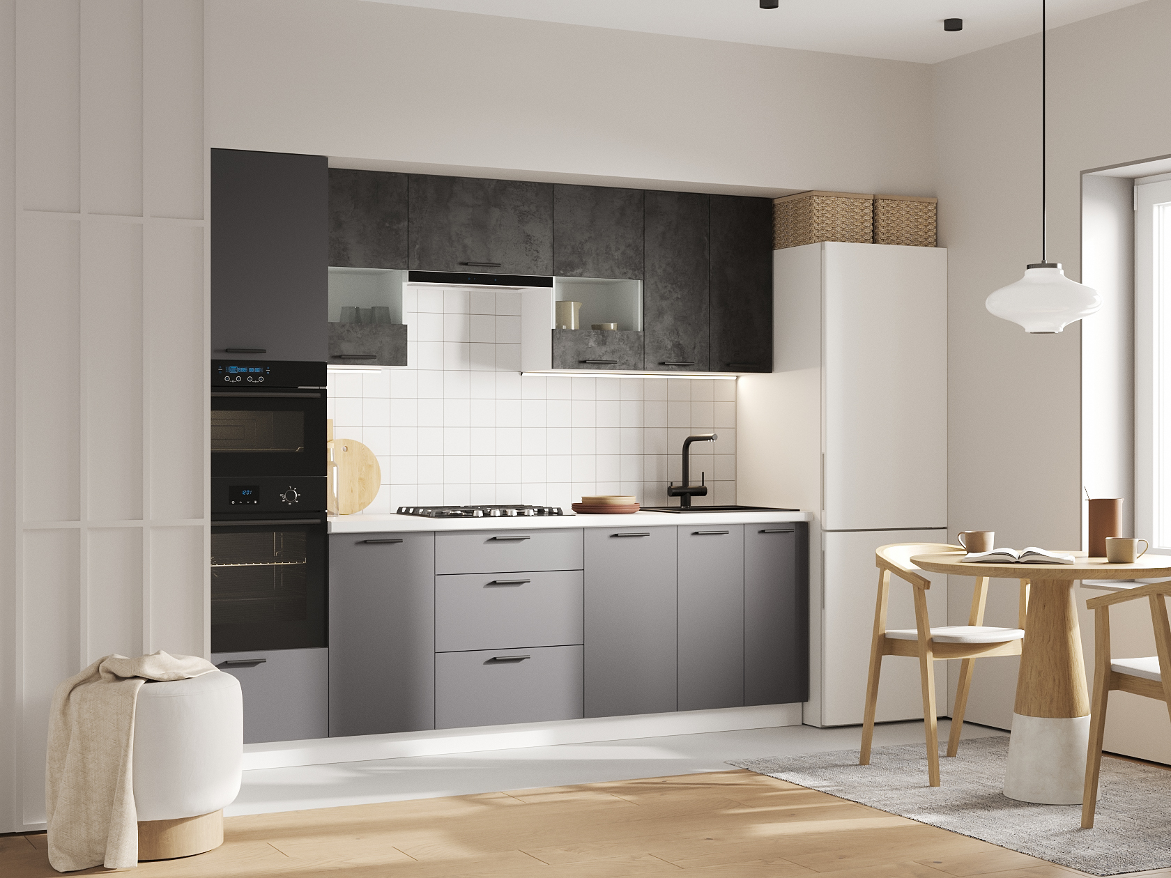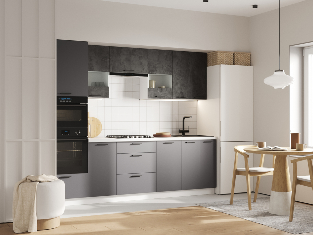 Кухонный гарнитур Модус 260 см со стеклом Белый / Цемент темный со стеклом / Графит серый