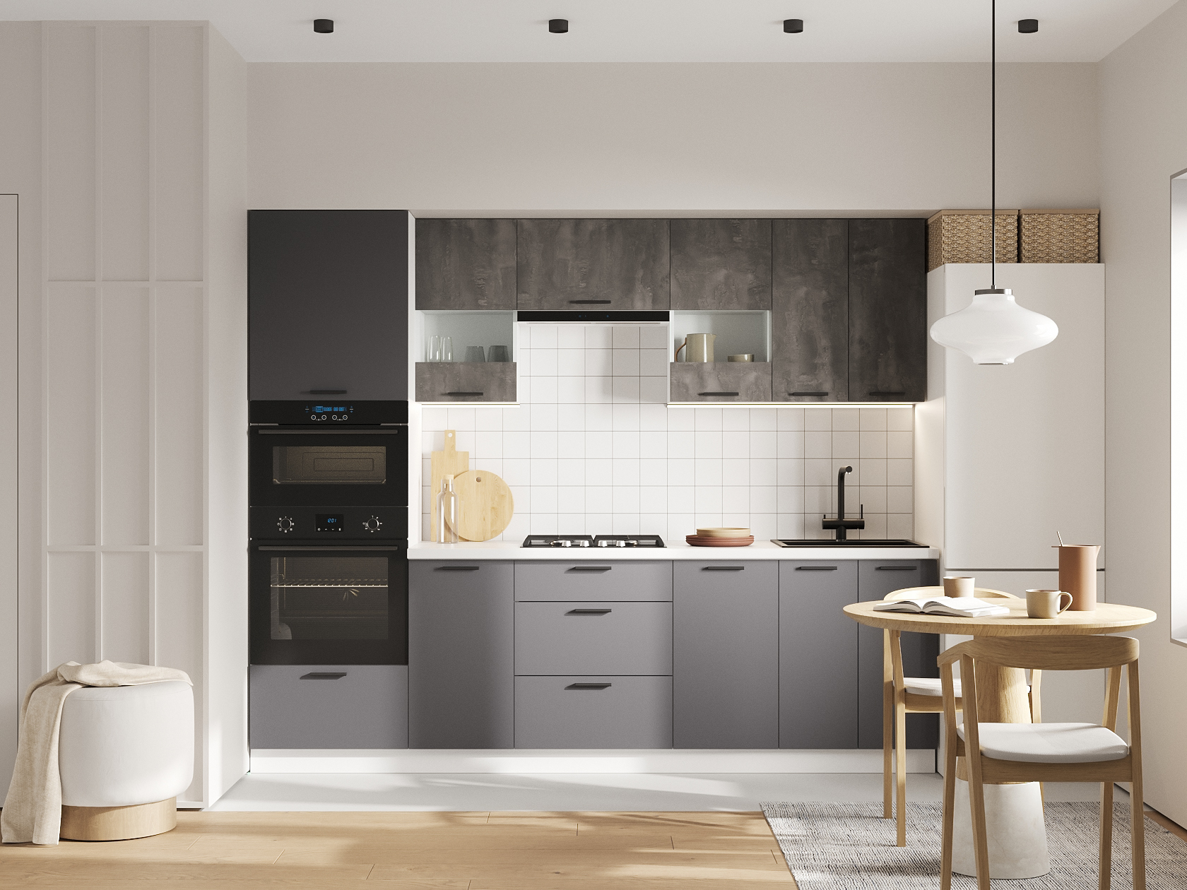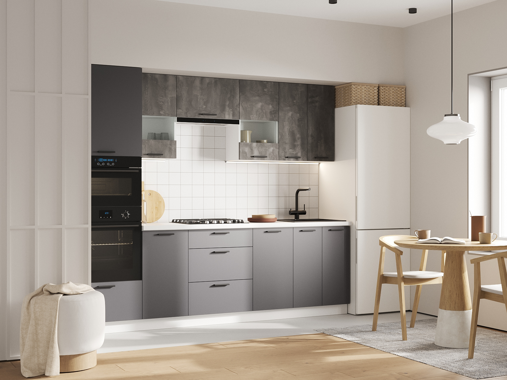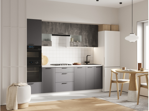 Кухонный гарнитур Модус 260 см со стеклом Белый / Камень темный со стеклом / Графит серый